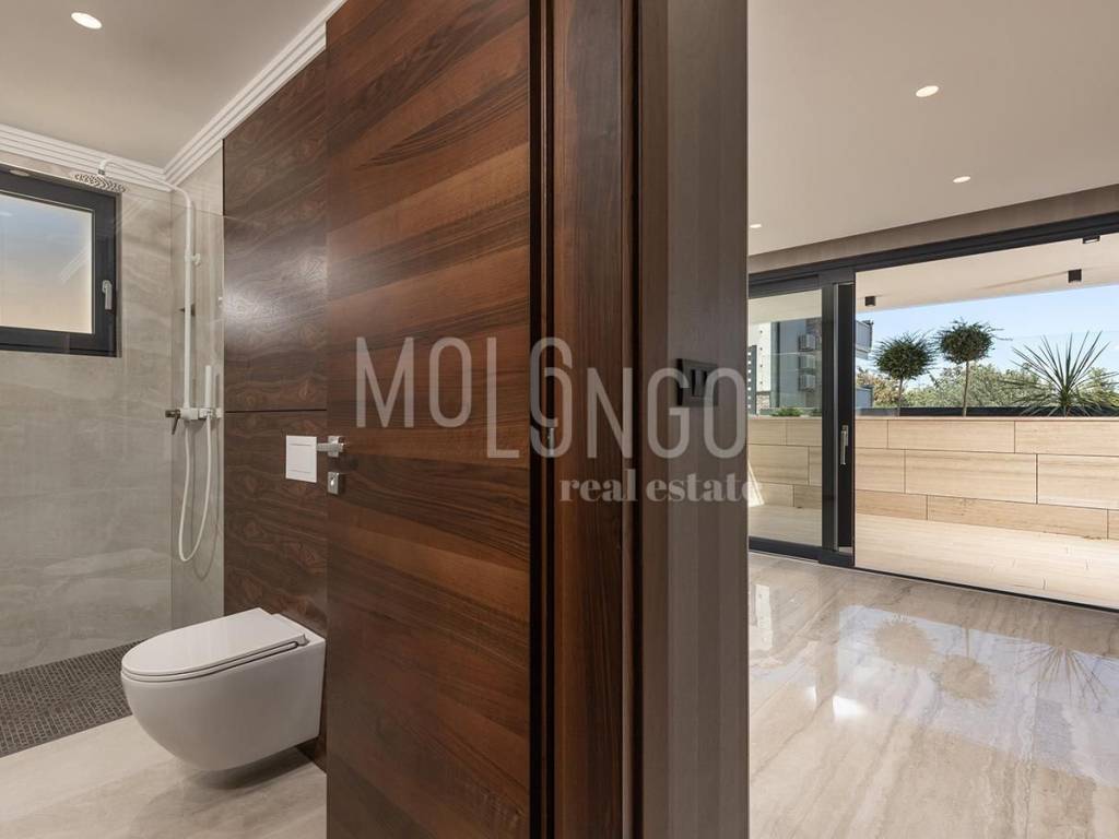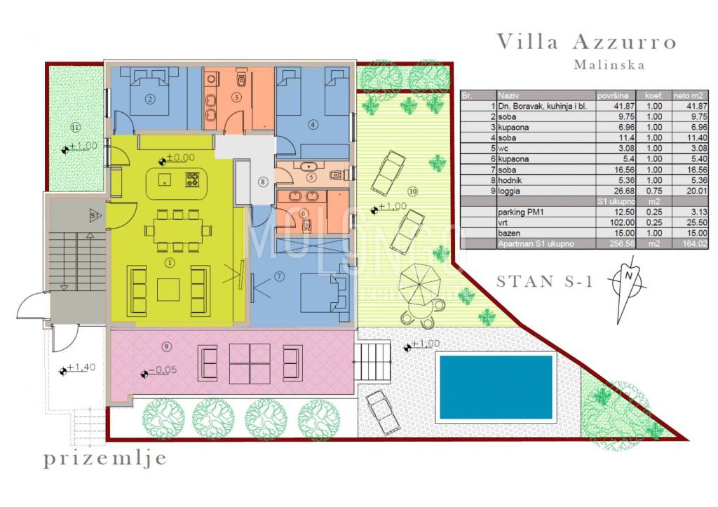 MALINSKA, luxury apartment of 132.69 m2, in a great location only 100 m from the sea. The apartment is located on the ground floor of a villa with a total of three apartments, and consists of a hallway, a kitchen with a dining room and a living room that leads to a large terrace of 27 m2, three bedrooms, two bathrooms, a toilet.