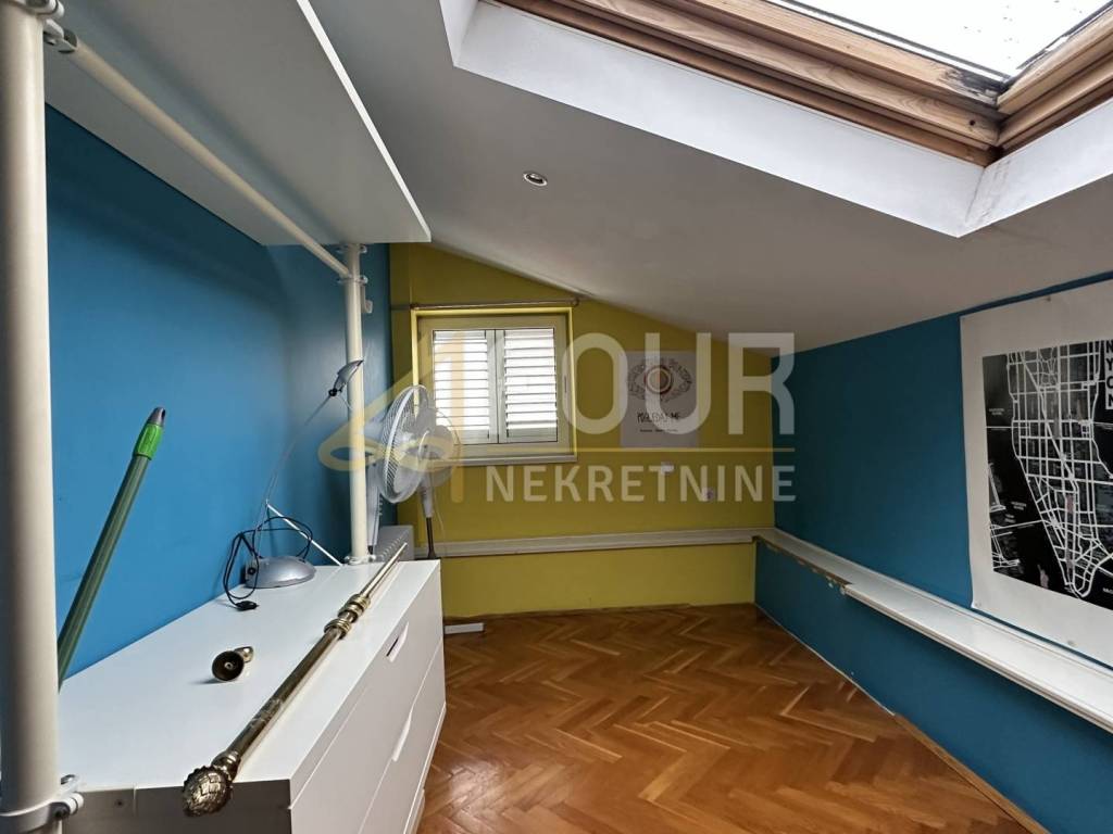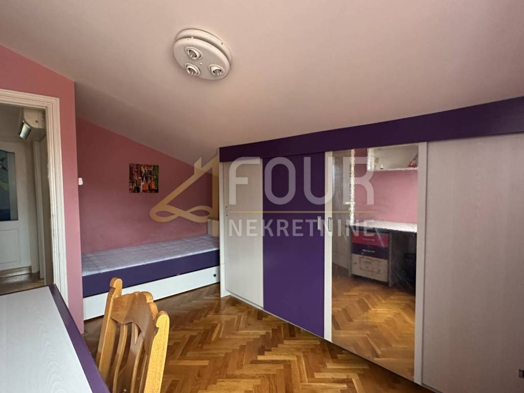 On the first level there is an entrance hall, living room, kitchen with dining area, bathroom, one bedroom, and access to the balcony and terrace, while the attic consists of four bedrooms, a hallway, and an additional bathroom. Thanks to its layout, the property is well-suited for a larger family.