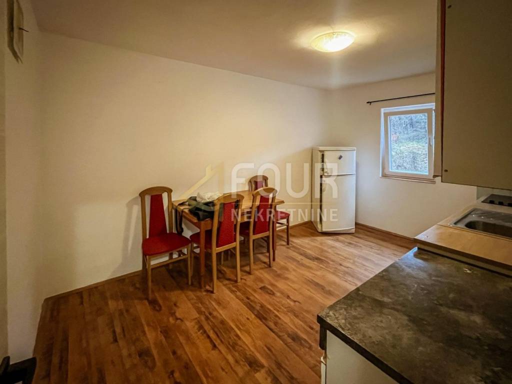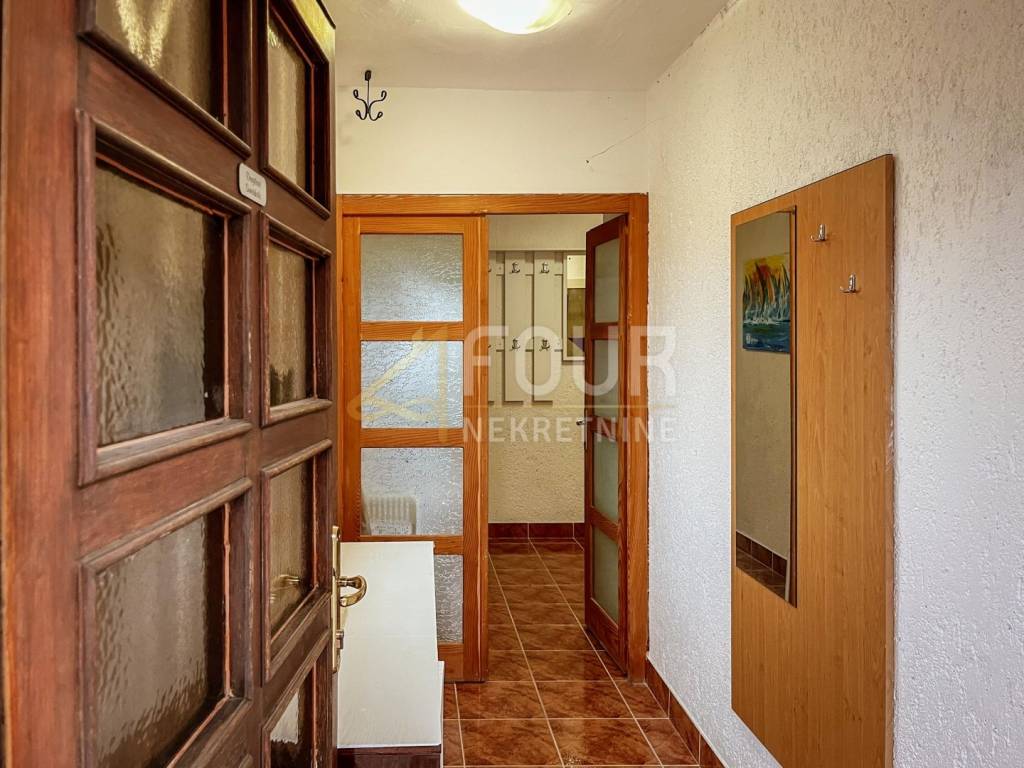 Apartment for sale with an area of 55.15m2 in a quiet and pleasant environment of family houses. The apartment is fully furnished and consists of a hallway, bathroom, hallway, bedroom, living room, kitchen with dining area, and a balcony of 10 m2 with a sea view in the distance. The apartment also includes a storage room in the basement and a part of the garden. The apartment has air conditioning and a wood stove, PVC joinery in all rooms except the bathroom. One parking space is provided.