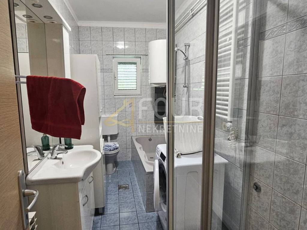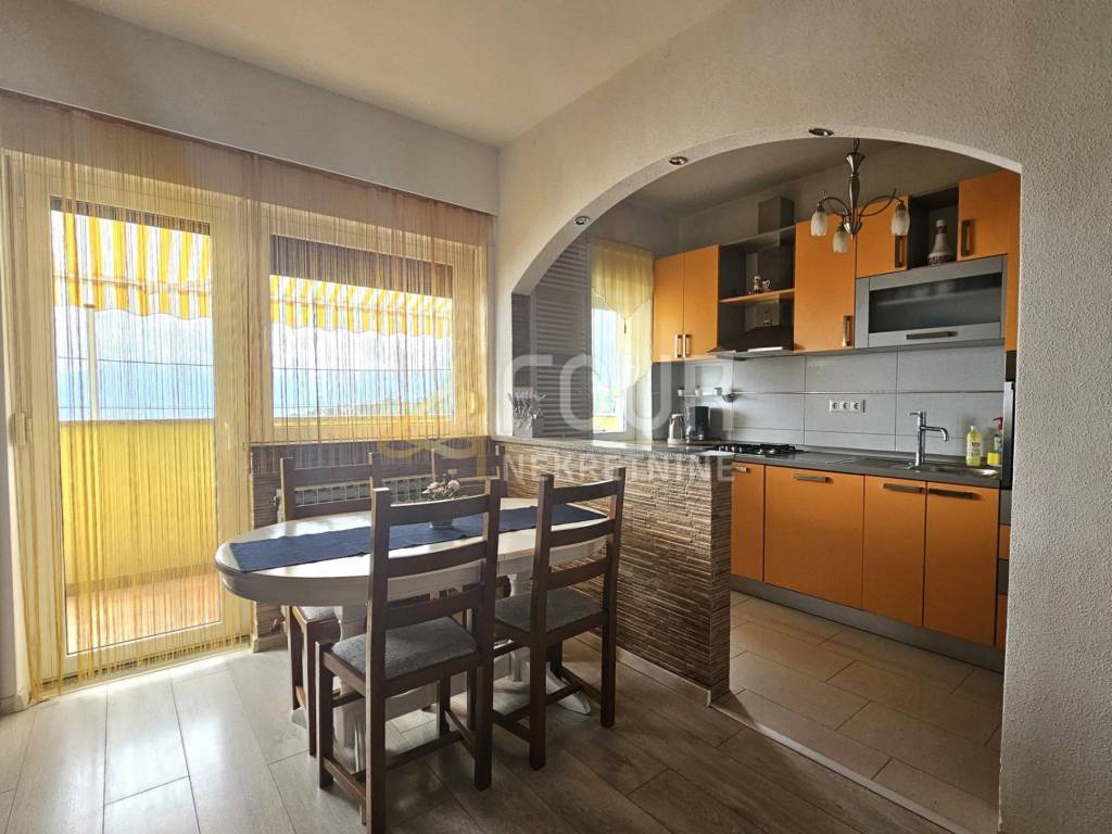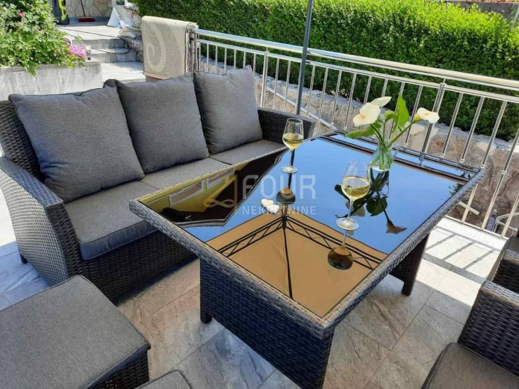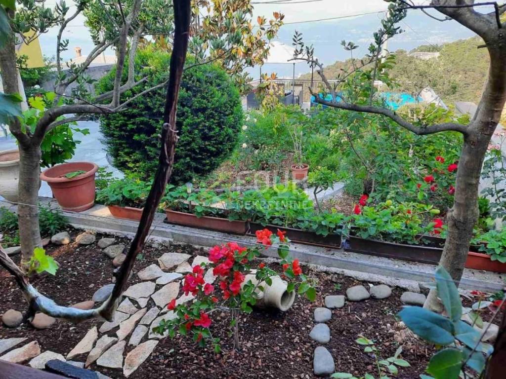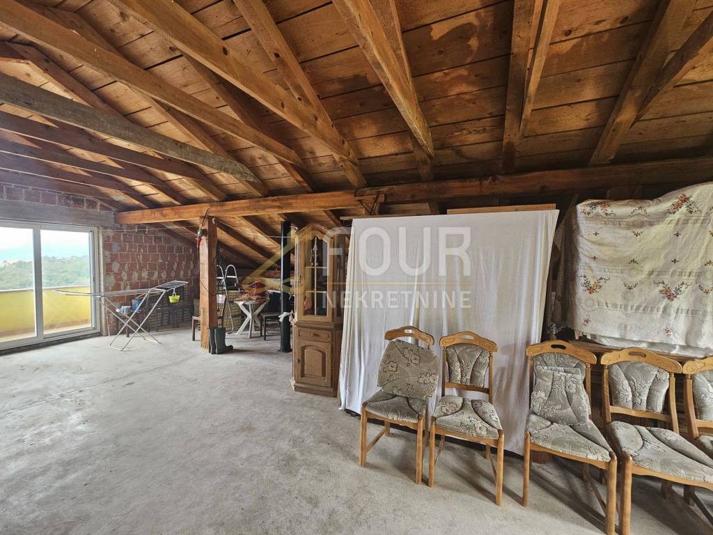 We offer a beautiful detached house with a panoramic view, three garages and a cultivated garden of 256m2 with a swimming pool! There are two smaller taverns in the basement. In front is a beautiful garden with a spacious terrace, swimming pool, garden and summer kitchen. On the high ground floor there are two completely adapted apartments, 90m2 - 3 bedrooms + bathroom, balcony and 40 m2 - 1 bedroom + bathroom, balcony. In the high attic there is an apartment with a separate entrance in the Rohbau edition. The facade, roof and carpentry of the house have been renovated. Great house in a quiet location with a view of the entire Kvarner!
