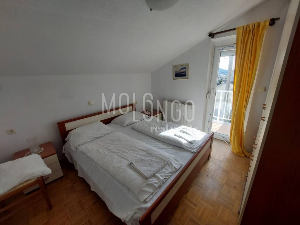 The apartment is on the 1st floor and consists of an entrance hall, kitchen with dining room and living room, bathroom, and two bedrooms, one of which has access to its own terrace. The living room has a large gallery and an exit to two covered terraces with a view of the sea. The apartment also has a 10m2 storage room on the ground floor. A very neat and spacious apartment, all external joinery is new, it is sold furnished and ready to move in, without any additional investments required.