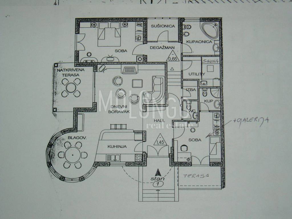 On the upper ground floor there is an apartment with a gallery, a terrace, 2 loggias, 2 bedrooms, a living room, a dining room and a kitchen, a drying room, a main bathroom with a toilet, a hydromassage bath and a sauna, a smaller bathroom, a cellar and a laundry room.