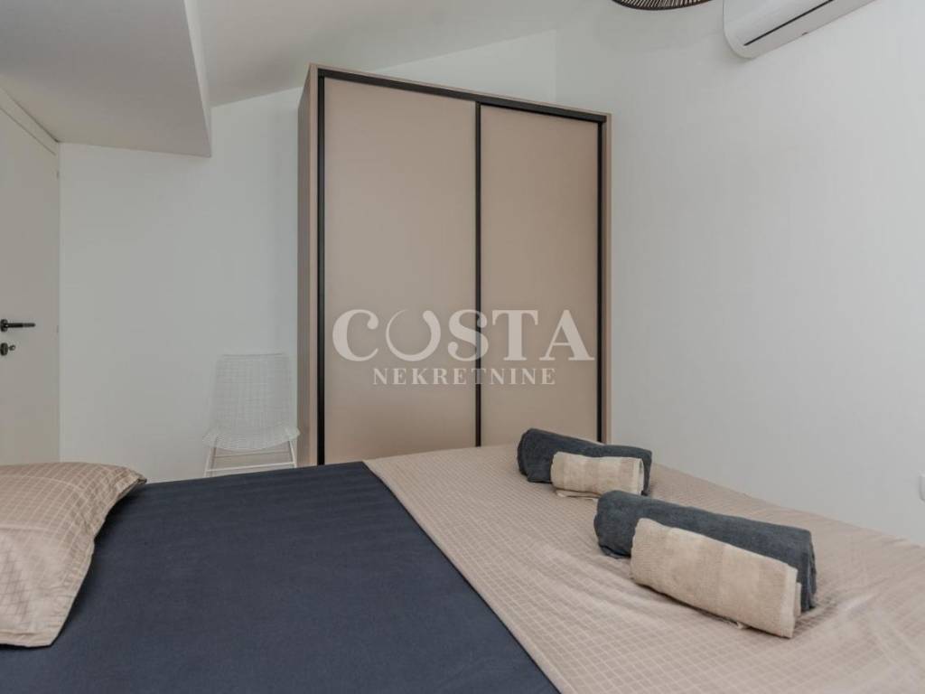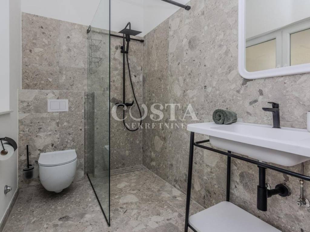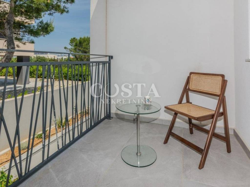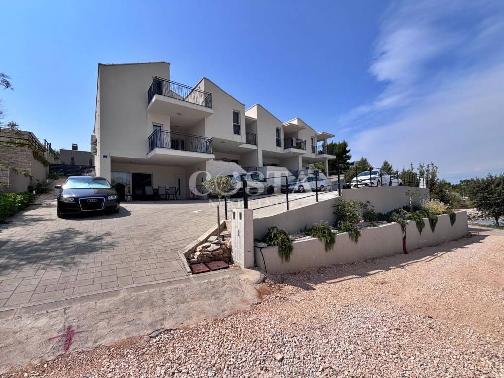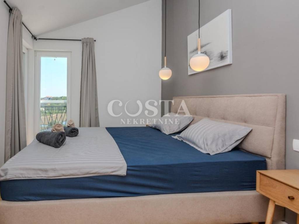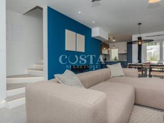 A modern furnished, two-story apartment is for sale in Zaton near Zadar. The apartment, measuring 118 m2, is located in a smaller residential building, a terraced house with four units. The ground floor has a living room and kitchen, an additional toilet, a storage room and a loggia. The living room opens onto a terrace, or a courtyard with a barbecue. On the first floor there are three bedrooms, two bathrooms, a hallway and a loggia. Two private parking spaces are available in the courtyard.