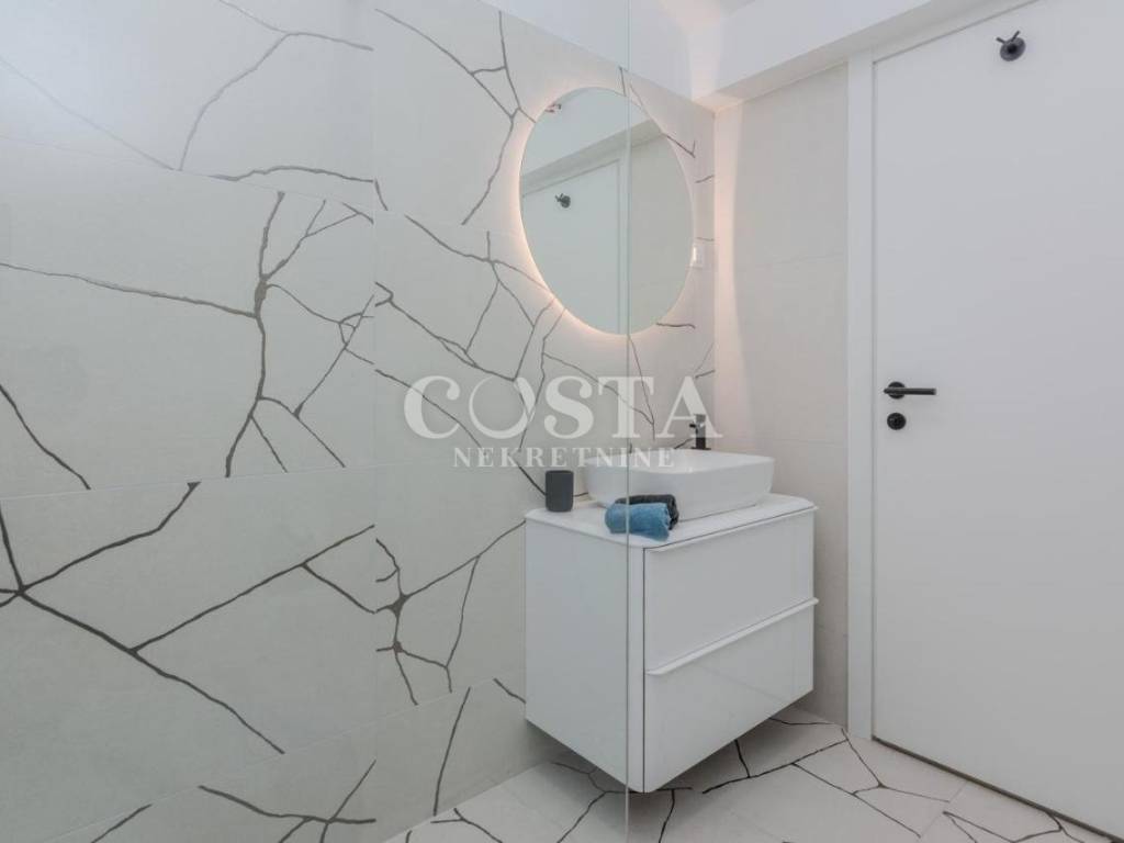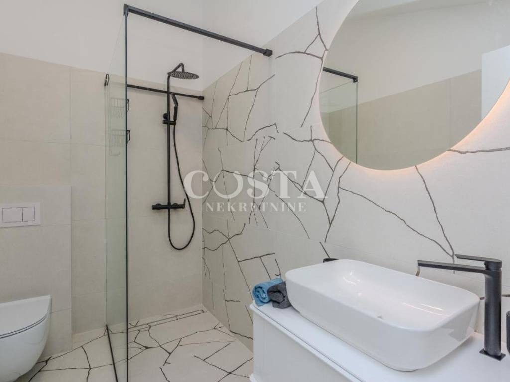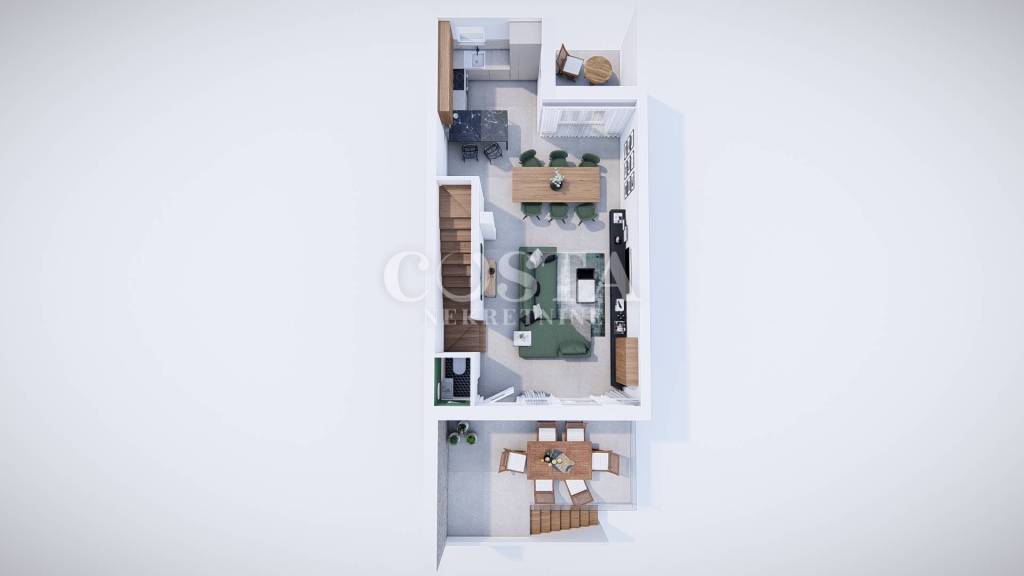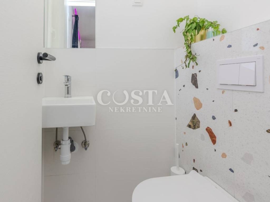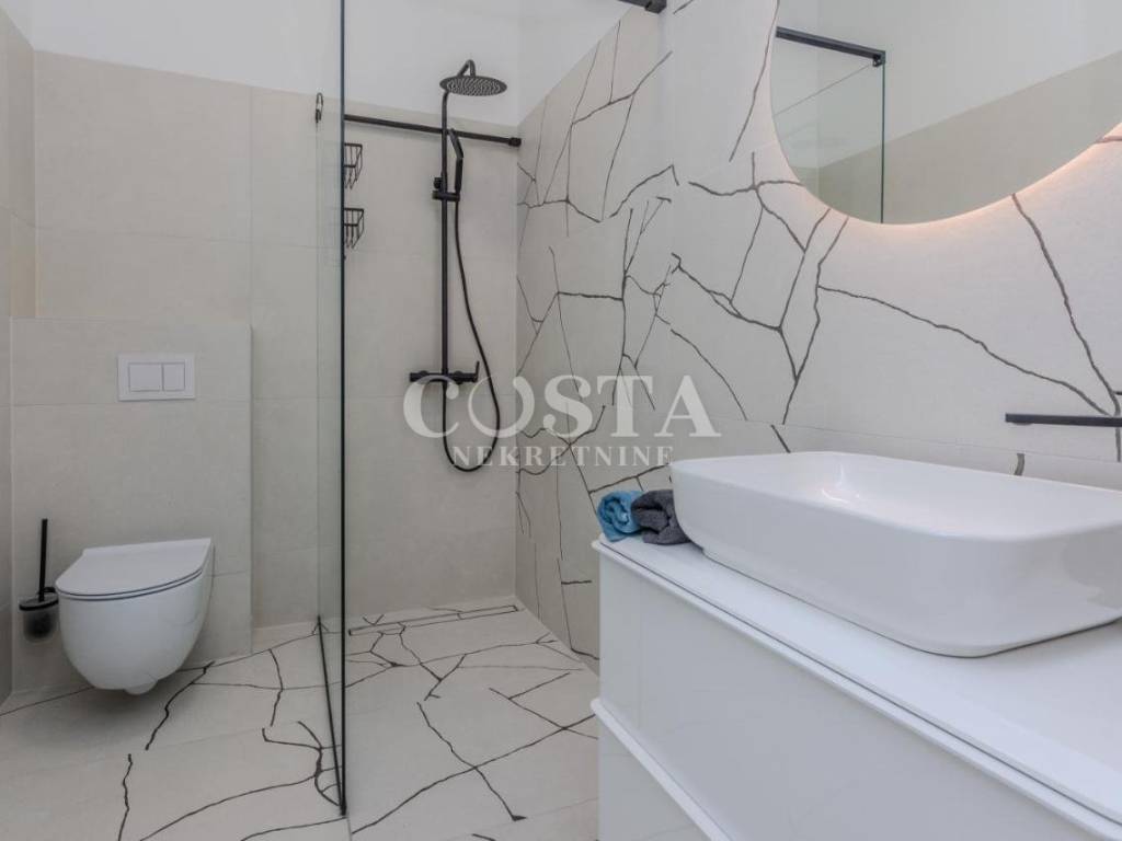 A modern furnished, two-story apartment is for sale in Zaton near Zadar. The apartment, measuring 118 m2, is located in a smaller residential building, a terraced house with four units. The ground floor has a living room and kitchen, an additional toilet, a storage room and a loggia. The living room opens onto a terrace, or a courtyard with a barbecue. On the first floor there are three bedrooms, two bathrooms, a hallway and a loggia. Two private parking spaces are available in the courtyard.