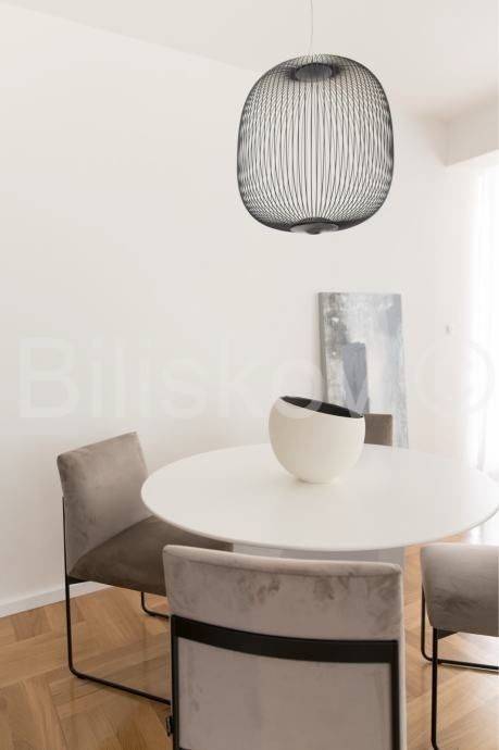 The newly renovated apartment consists of two bedrooms, a spacious living room, a kitchen with dining area, a bathroom with WC, an additional guest WC, and a balcony.