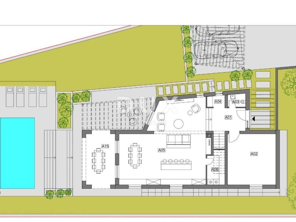 Na okućnici vile planiran je infinity bazen sa pogledom na more, te 2 natkrivena mjesta i dodatna 2 ne natkirvena parking mjesta.