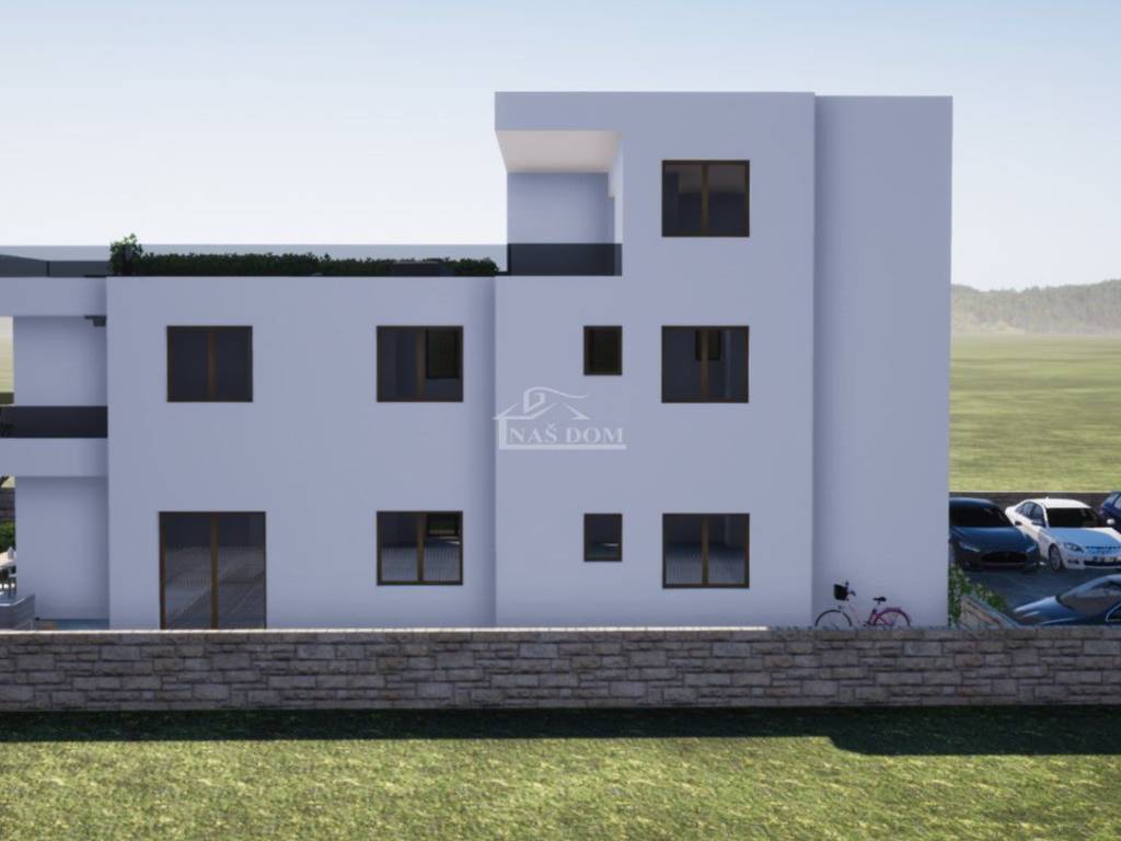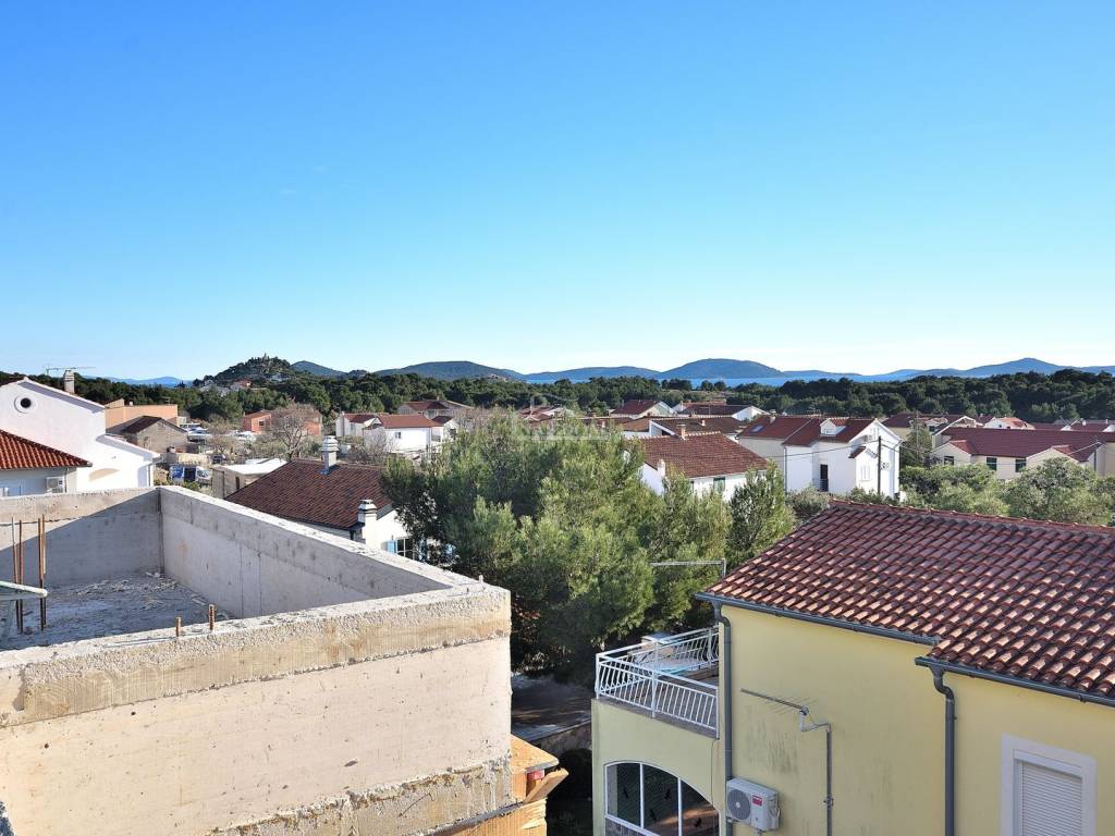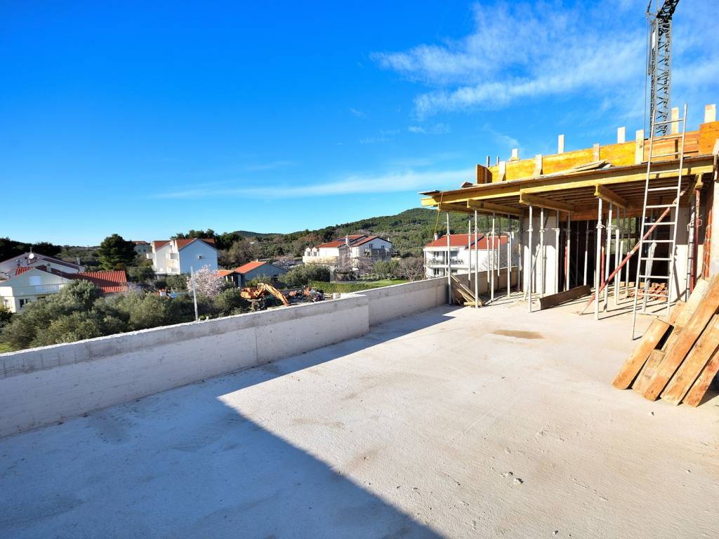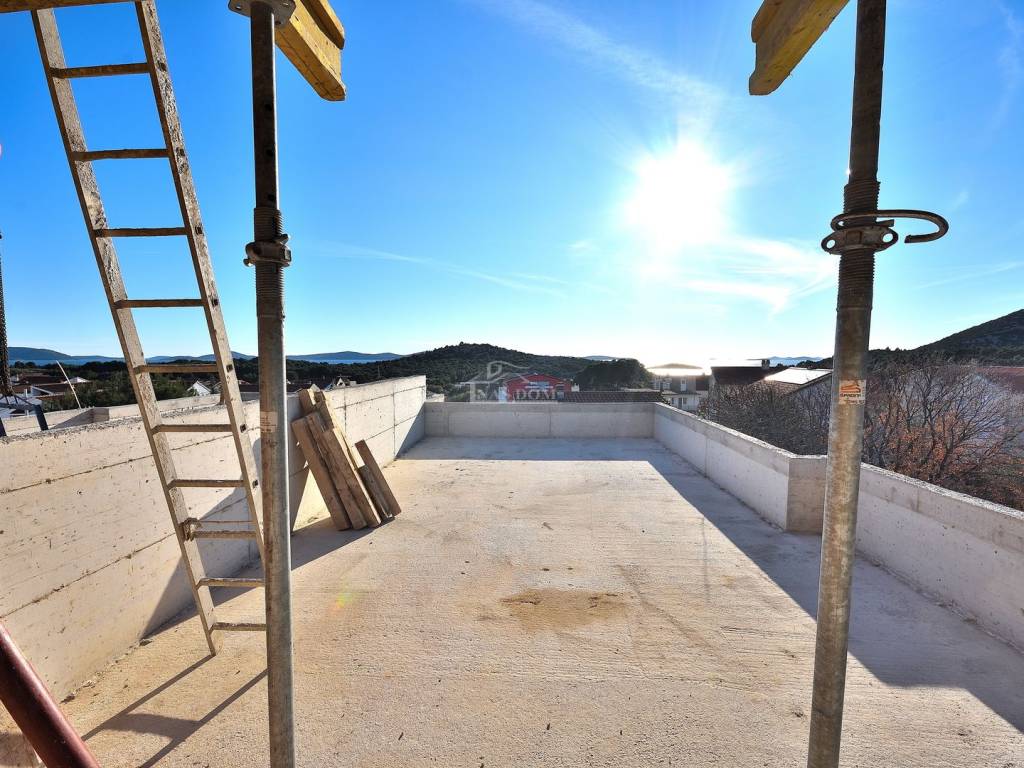 TRIBUNJ - SOVLJE, a small building under construction with 4 residential units, only 400 m from the beach and the center, a two-story apartment with a rooftop terrace is for sale, labeled APARTMENT S3 - two-story apartment with a total usable area of 108.13 m2 consisting of a floor comprising: hallway, kitchen with dining area and living room, terrace of 9.44 m2 with sea view, two bedrooms, bathroom, and a rooftop terrace of 35.64 m2 which consists of a summer kitchen of 18.56 m2, covered terrace of 11.14 m2, and uncovered terrace of 57.18 m2 with panoramic sea views, plus 1 parking space in front of the building.