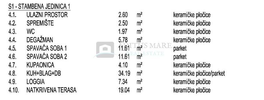 Stan S1 na prvom katu objekta je funkcionalno projektiran i pruža ugodan boravak, s prostranim dnevnim dijelom koji ima izravan izlaz na natkrivenu terasu, čime se postiže osjećaj privatnosti i otvorenosti prostora. Nekretnina je pogodna za cjelogodišnje korištenje, ali i kao investicija za turistički najam.