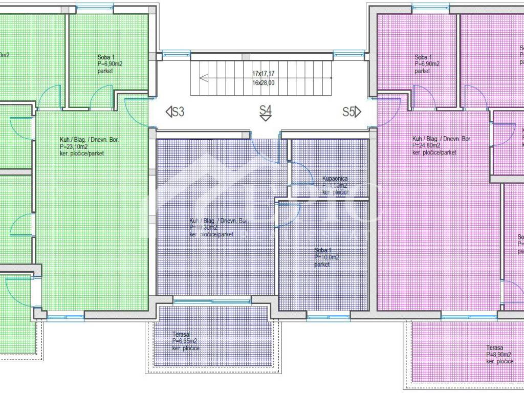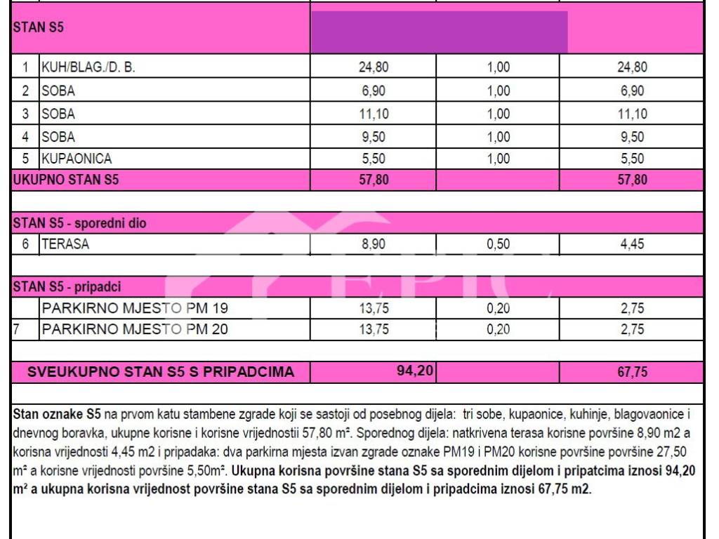 Apartment labeled S5 in a building with eight residential units consists of a kitchen with dining area and living room, three bedrooms, a bathroom, and a covered terrace. The apartment includes two parking spaces. The total usable area of the apartment, including auxiliary parts and attachments, is 94.20 m², while the total usable living area of the apartment is 67.75 m².