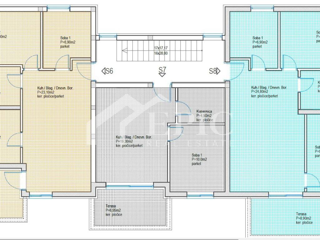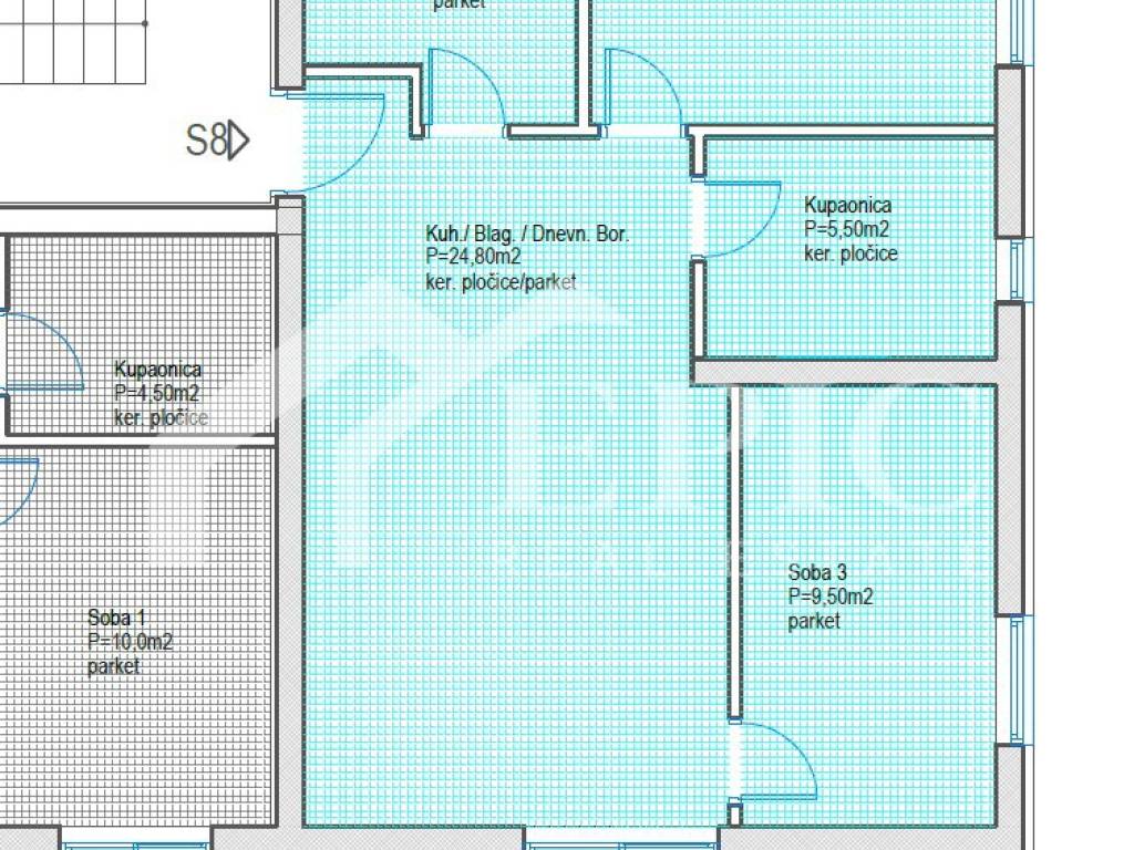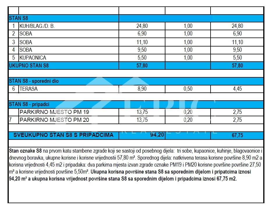Apartment labeled S8 in a building with eight residential units consists of a kitchen with dining area and living room, three bedrooms, a bathroom, and a covered terrace. The apartment also includes two parking spaces. The total usable area of the apartment, including auxiliary parts and appurtenances, is 94.20 m², while the total net living area of the apartment is 67.75 m².