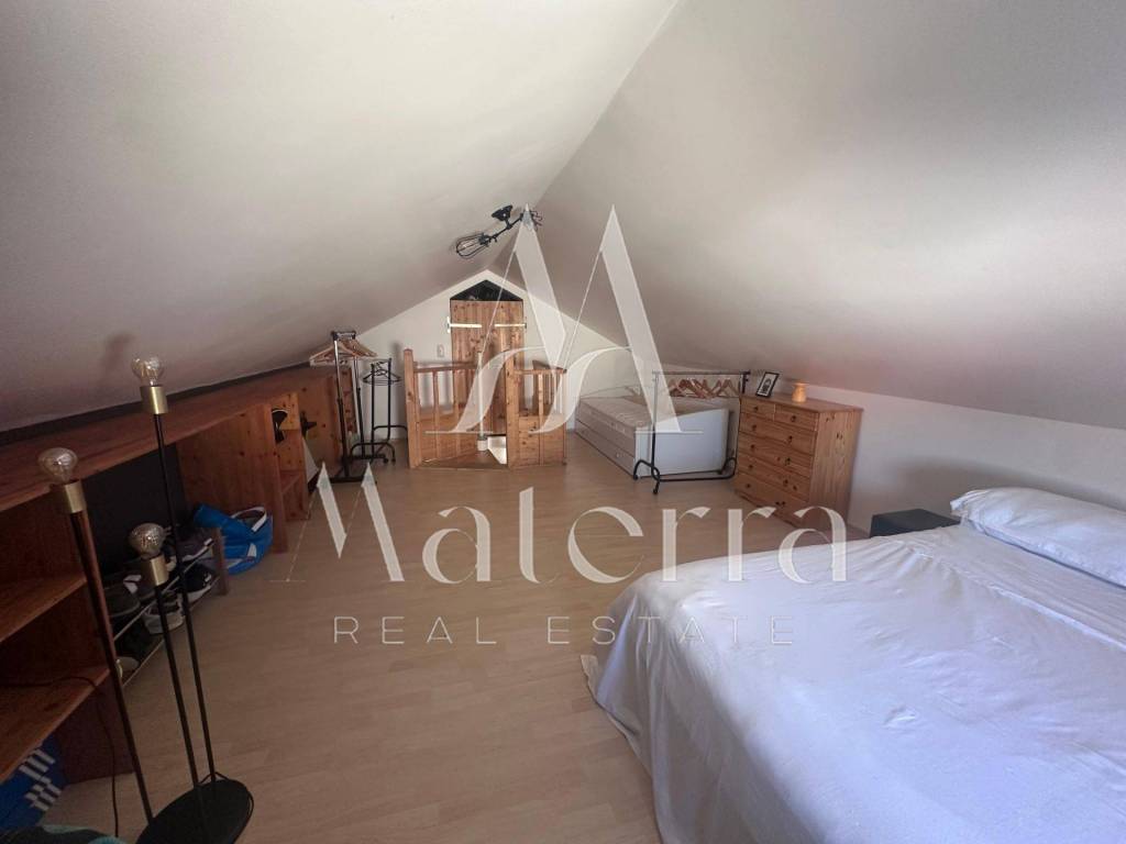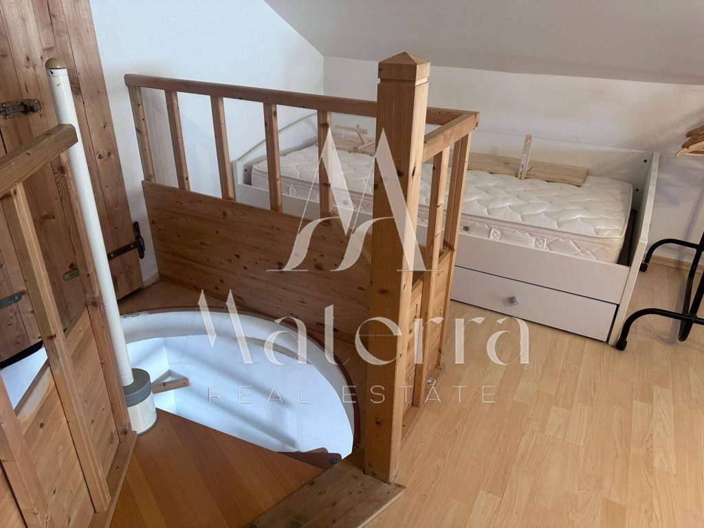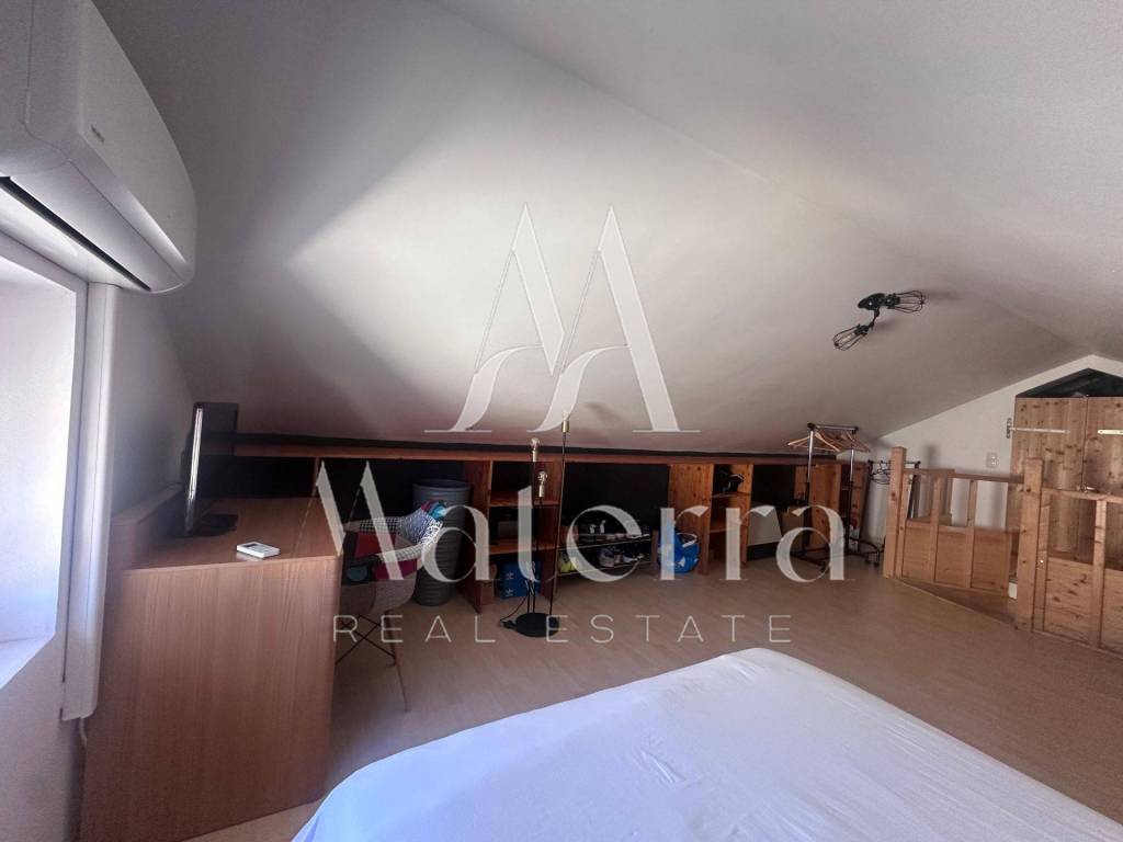 The apartment consists of two levels. The first level features a kitchen with a dining area, a living room, a bedroom, a bathroom with a toilet, and a spacious terrace offering a beautiful sea view. Internal stairs lead to the second level, which comprises a large bedroom with an office area and a walk-in wardrobe.