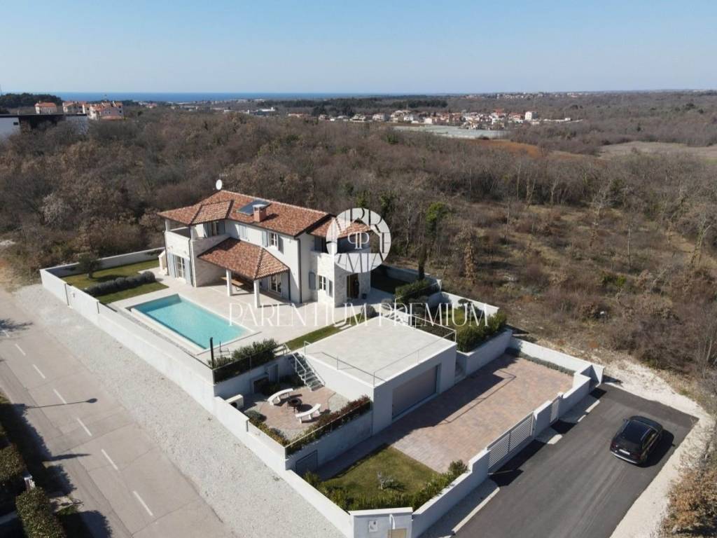 Istria, PorecThis spacious villa of 210m2 is for sale, located on a plot of 936m2 near the city of Porec.The villa is divided into 2 floors.The ground floor has an entrance hall, spacious kitchen with dining area, living room, bedroom with en suite bathroom, boiler room and guest toilet.The living room and dining room are connected by elegant exits to the outdoor terrace and sun deck around a unique overflow, heated pool of 52m2.Upstairs we have 3 bedrooms, 2 bathrooms and 2 terraces with great sea views.Underfloor heating on a heat pump was carried out throughout the house.For an additional atmosphere in the winter, we have a fireplace in the living room and fan coilers will cool the temperature in the summer.2 solar panels on the roof of the house are enough to heat the water in the boilers.In the yard we have a place for barbecue, and the owner will set up a summer kitchen for undisturbed enjoyment of the outdoor environment during the summer.The outdoor parking will be covered with a pergola and a garage of more than 50m2 is enough for safe parking of 2 cars, several motorcycles and bicycles.Given the location, comfort and spaciousness of this villa is certainly the right opportunity for people who love to enjoy life!