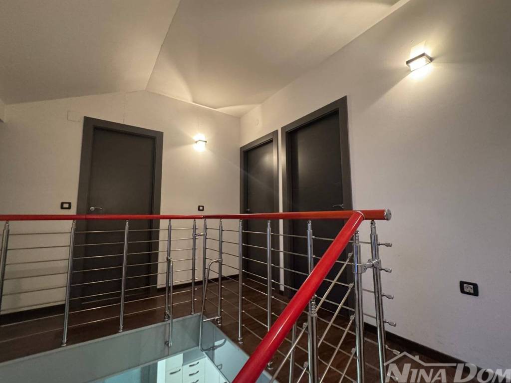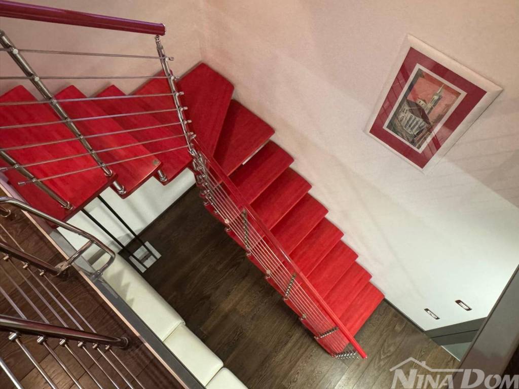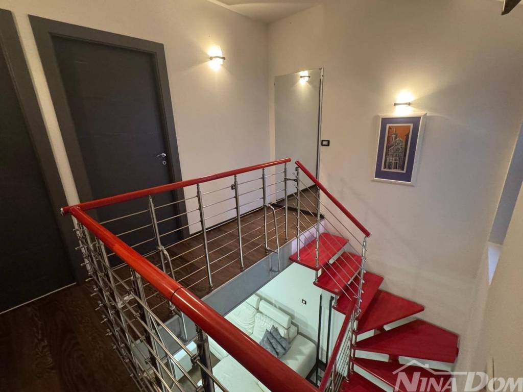 Unutarnje stepenice za kat, na katu tri spavaće sobe od kojih jedna ima svoju kupaonicu i garderobu, lođa, kupaona i balkon.