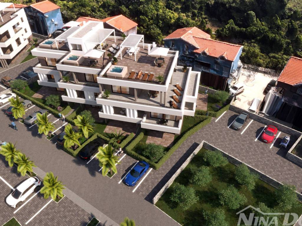 The apartment is part of a luxury mini-resort with a private ramp, consisting of five modernly designed buildings. The sandy beach is 80 meters away, the Zaton tourist resort 500 meters, and cafés, restaurants, and all necessary amenities are in the immediate vicinity.
