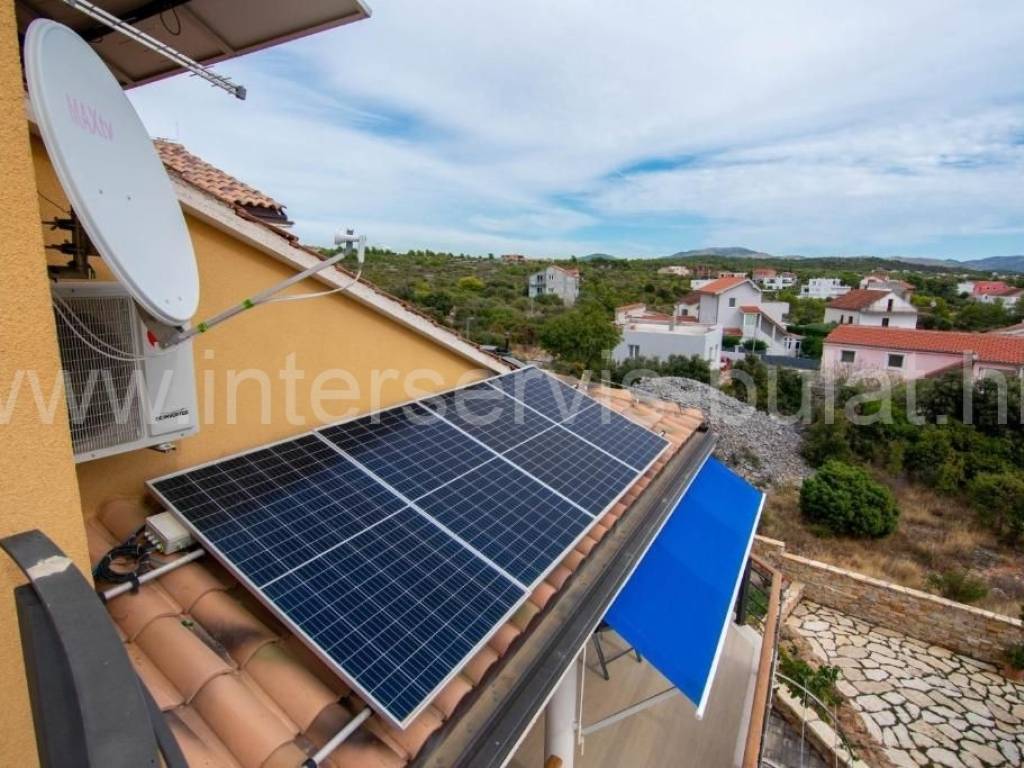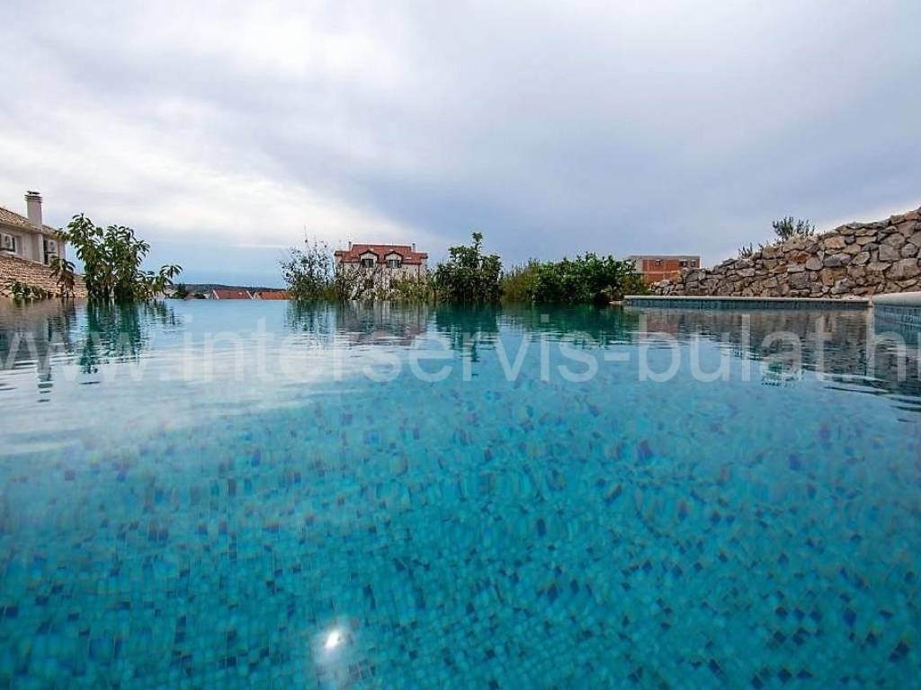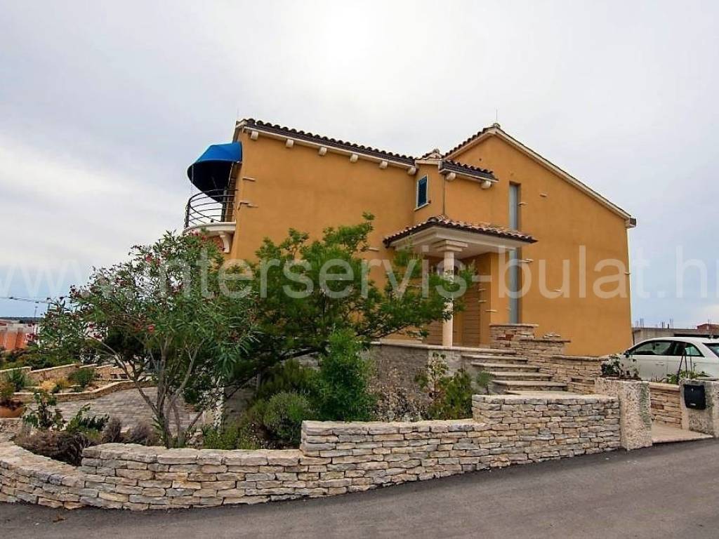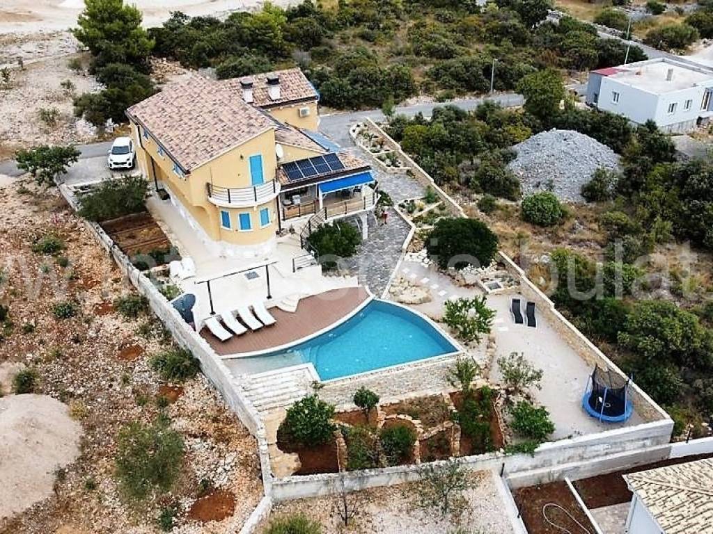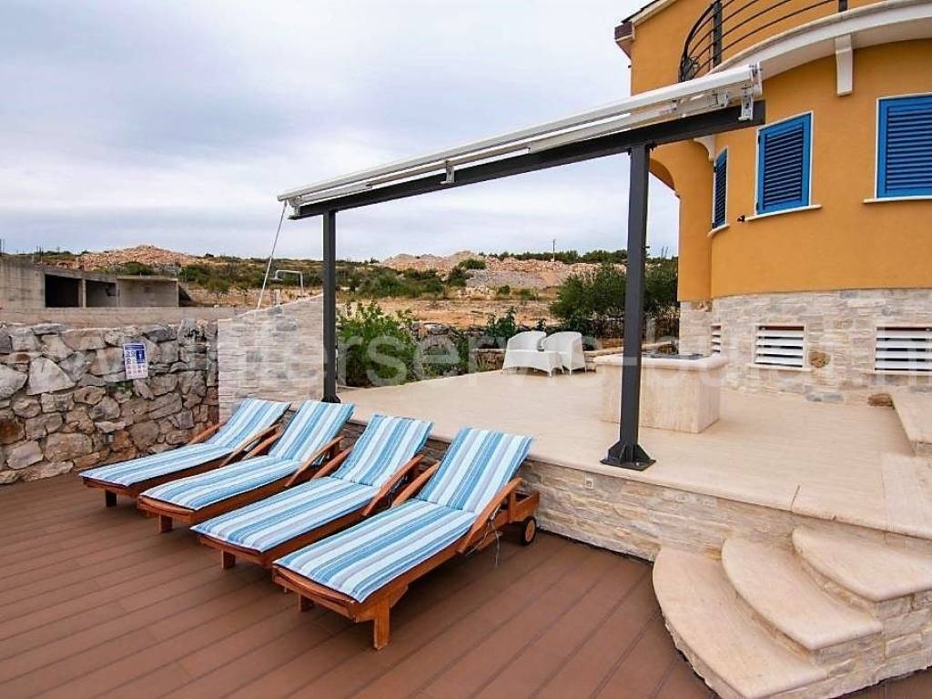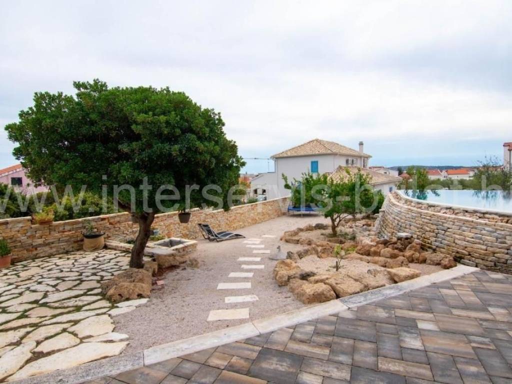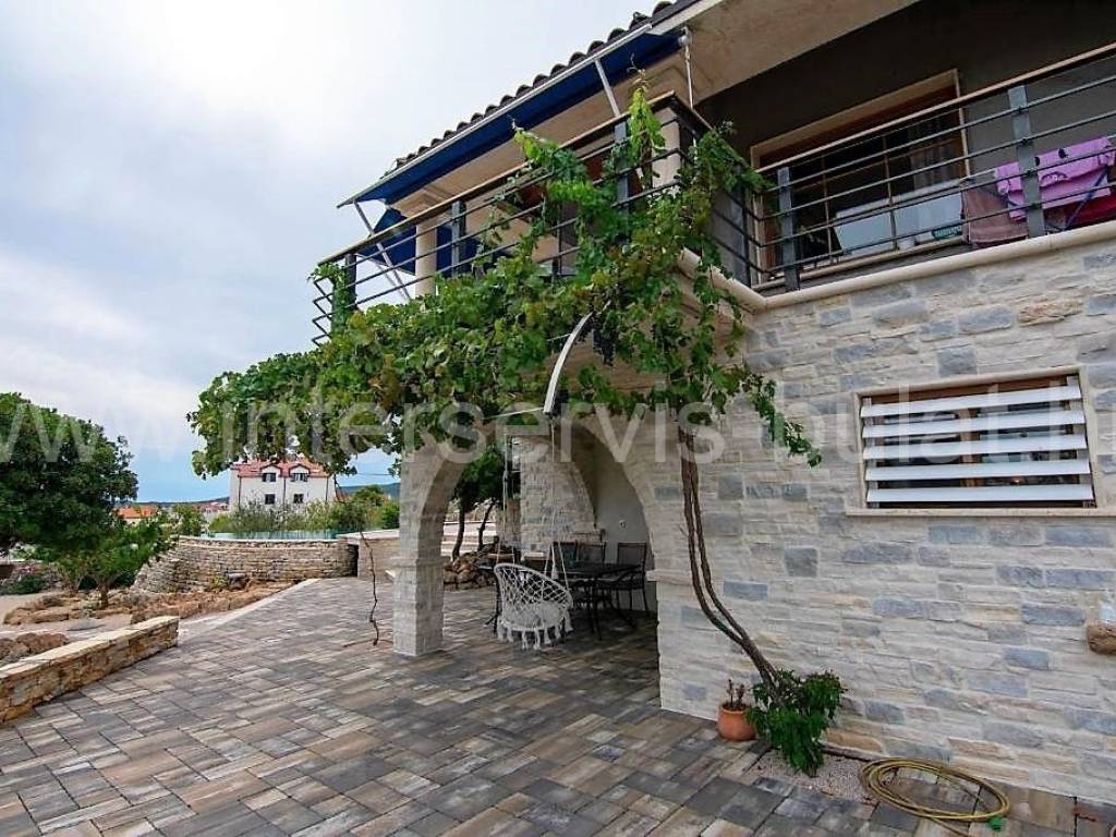 .::: Villa with pool in Brodarica :::. In a quiet location in Brodarica, there is a beautiful detached house with basement + ground floor + 1st floor (gallery). The house consists of 5 bedrooms, two of which have their own bathroom, 3 living rooms with kitchen and dining room. One has a fireplace and a professional pizza oven (bread oven). There are a total of 4 bathrooms and two toilets in the house. The living space can be accessed from the main entrance and two auxiliary ones, so it can be functionally converted into 3 separate apartments with separate entrances if necessary. The house has floor heating that can work via a wood-burning fireplace in the main living room or via electricity via heat pump, with the help of solar collectors that primarily heat sanitary water. The house also includes a garage, engine room and tavern (pantry). The carpentry is made of three-layer laminated wood (larch) with aluminum shutters. Photovoltaic collectors are installed on the roof for own electricity production with a contract for the sale of excess energy. The installation for placing a wind turbine on the roof was also carried out. Next to the house there is a rainwater tank with a capacity of 100,000 liters. In the yard of the house there is a swimming pool with an area of 51sqm. The pool is filled through a well in the ground where fresh and sea water (brackish) is mixed. The area of the landscaped and fenced plot is 975sqm, the garden is decorated with 14 different fruit trees (fig, olive, ...). Distance to the sea and beach is 350m. Tour of the property is available by prior arrangement and appointment booking (two days in advance). Please specify ID number of the property when contacting us. Looking forward to your call.