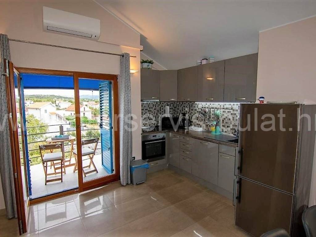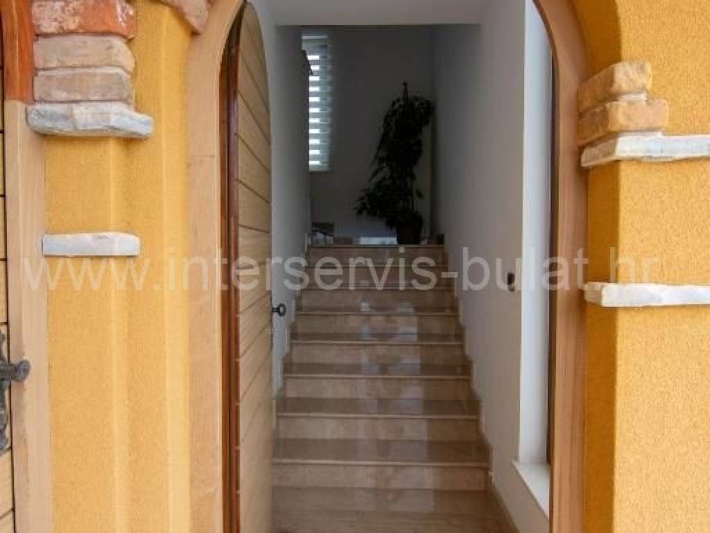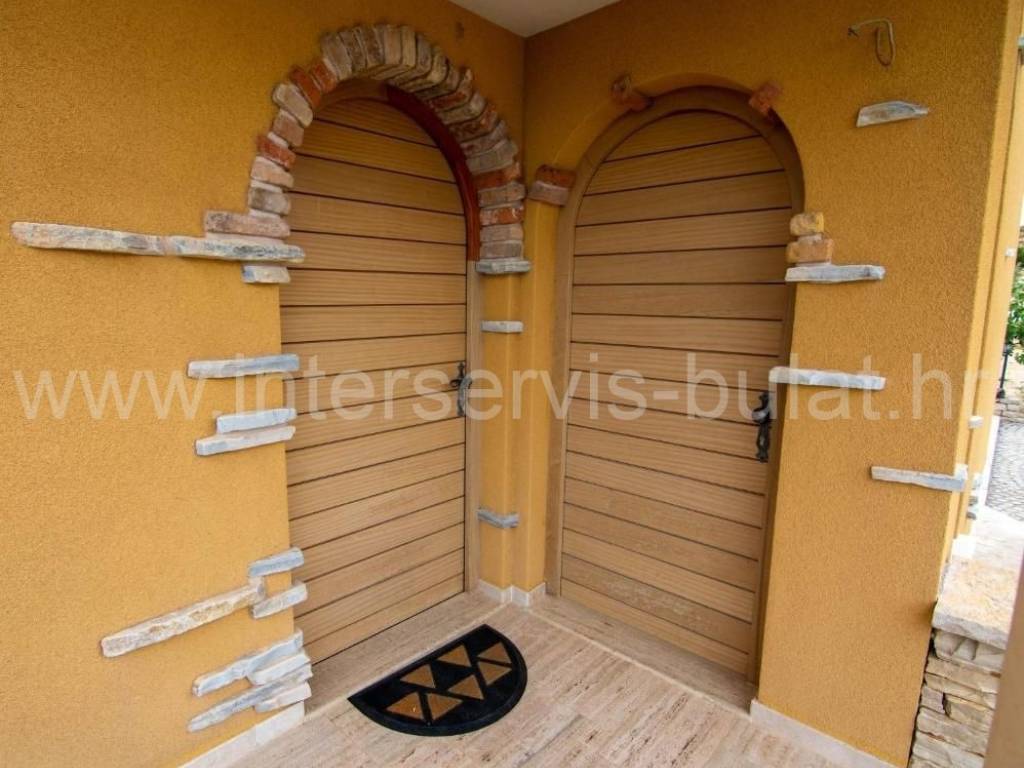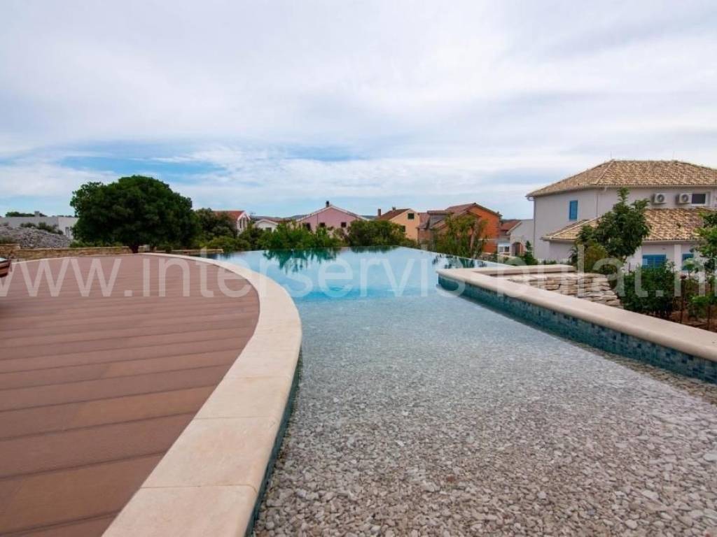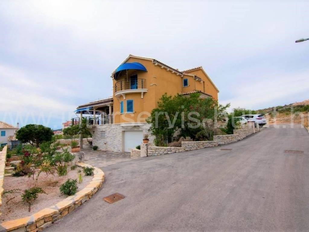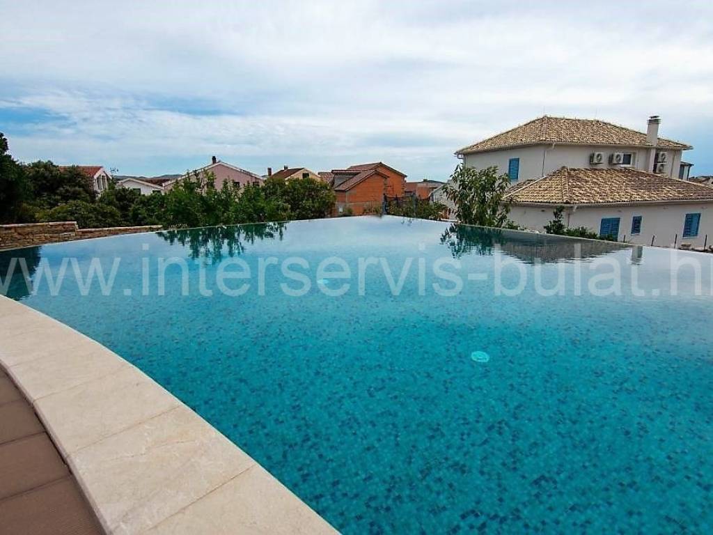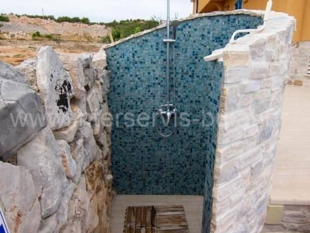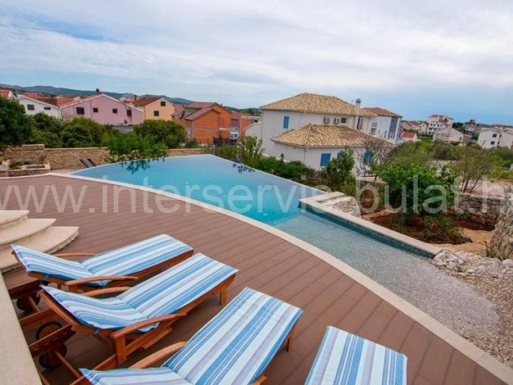 .::: Villa with pool in Brodarica :::. In a quiet location in Brodarica, there is a beautiful detached house with basement + ground floor + 1st floor (gallery). The house consists of 5 bedrooms, two of which have their own bathroom, 3 living rooms with kitchen and dining room. One has a fireplace and a professional pizza oven (bread oven). There are a total of 4 bathrooms and two toilets in the house. The living space can be accessed from the main entrance and two auxiliary ones, so it can be functionally converted into 3 separate apartments with separate entrances if necessary. The house has floor heating that can work via a wood-burning fireplace in the main living room or via electricity via heat pump, with the help of solar collectors that primarily heat sanitary water. The house also includes a garage, engine room and tavern (pantry). The carpentry is made of three-layer laminated wood (larch) with aluminum shutters. Photovoltaic collectors are installed on the roof for own electricity production with a contract for the sale of excess energy. The installation for placing a wind turbine on the roof was also carried out. Next to the house there is a rainwater tank with a capacity of 100,000 liters. In the yard of the house there is a swimming pool with an area of 51sqm. The pool is filled through a well in the ground where fresh and sea water (brackish) is mixed. The area of the landscaped and fenced plot is 975sqm, the garden is decorated with 14 different fruit trees (fig, olive, ...). Distance to the sea and beach is 350m. Tour of the property is available by prior arrangement and appointment booking (two days in advance). Please specify ID number of the property when contacting us. Looking forward to your call.
