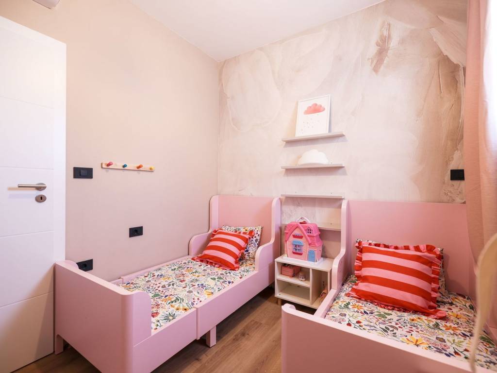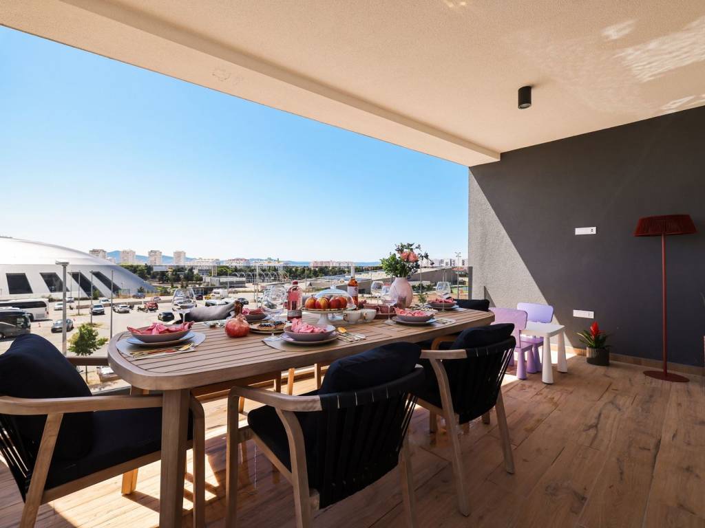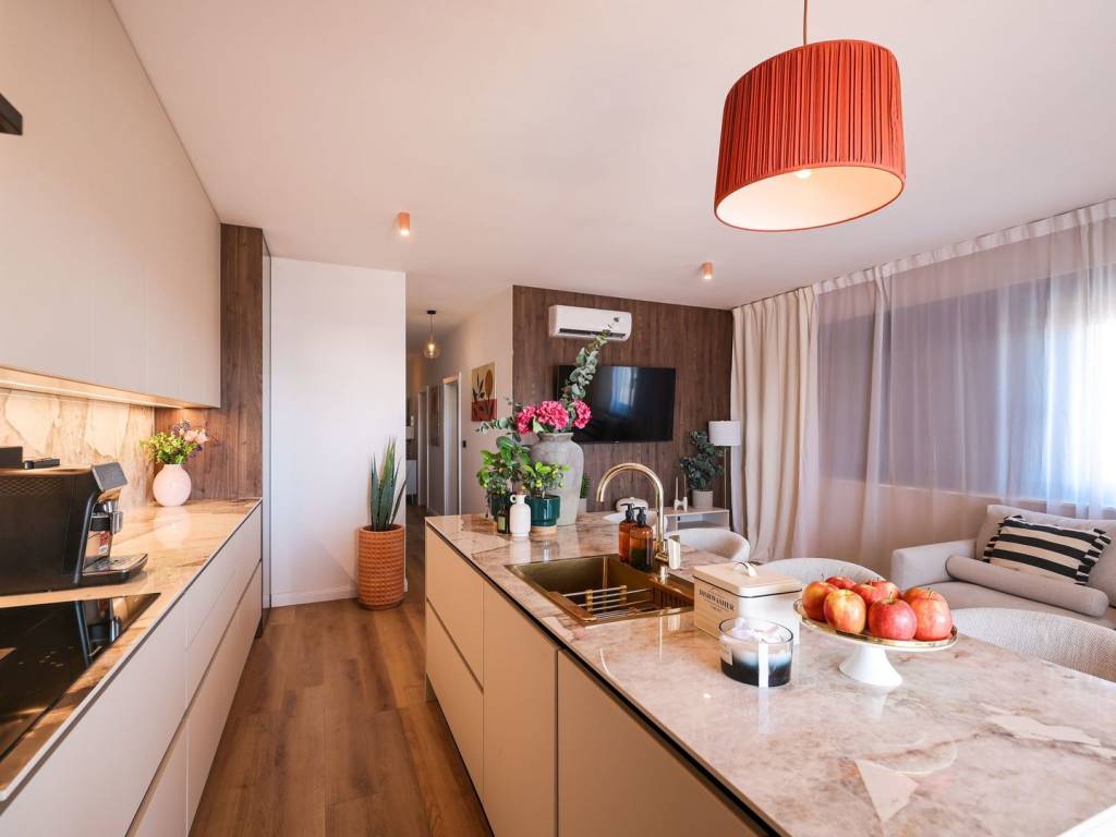 The living room, kitchen, and dining area form a spacious open-plan space with plenty of natural light and access to the terrace. Three bedrooms offer a good layout and comfort, while the bathrooms are equipped with modern ceramics and walk-in showers. The apartment has underfloor heating, air conditioning units, electric shutters, security doors, video intercom, and an alarm system.