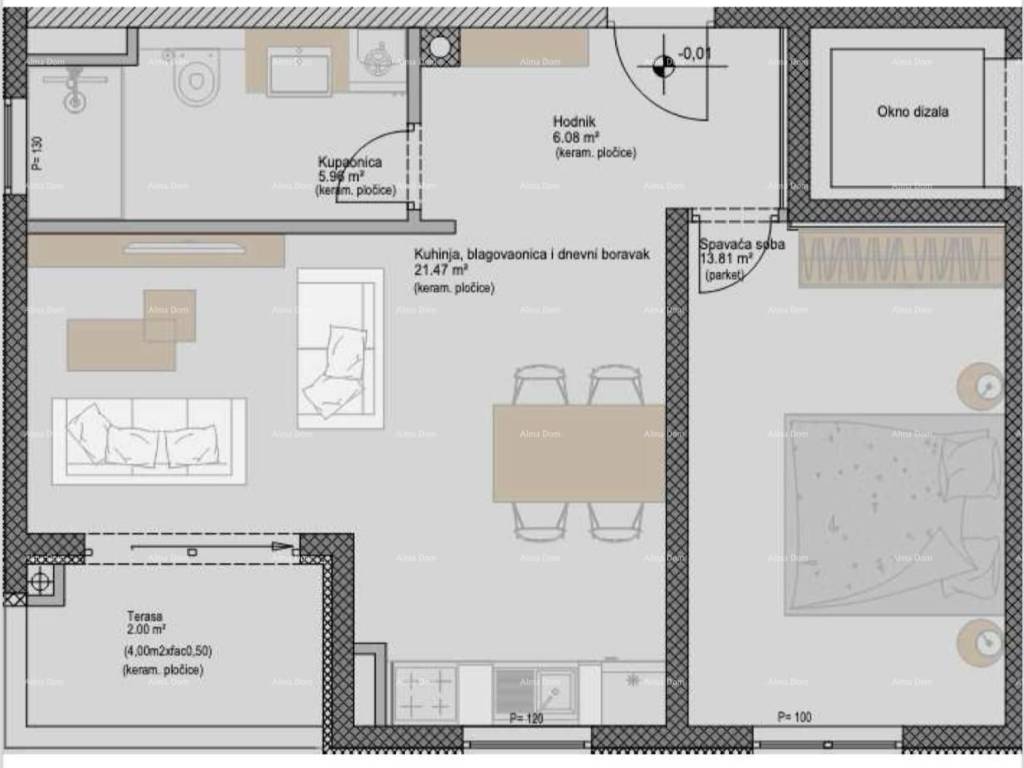 We are selling a modern apartment in a new building, in an excellent location in Poreč.The apartment is located on the ground floor of a three-story building. Apartment D consists of an entrance hall, a living room with a kitchen and dining area, a bedroom, a bathroom, and a terrace.Technical specifications of the apartment:- High-quality PVC joinery with mosquito nets and motorized blinds- Heating and cooling via a Daikin heat pump- Electric underfloor heating in the bathroom- Marazzi ceramic floor coveringsOptions for purchasing different types of parking spaces:Underground garage: 15,000 euros Covered parking space with the option for electric vehicle charging: 10,000 euros Uncovered parking space: 5,000 euros The underground level/garage has 13 parking spaces, including a parking space adapted for persons with disabilities and 6 outdoor parking spaces.The expected move-in date is: July 1, 2026.For more information, please contact: Azra: +385 91 611 5706 +385 98 420 885 azra@almadominvest.com