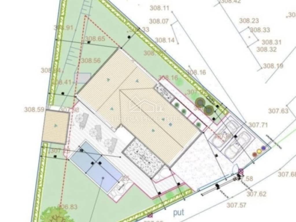 In the courtyard next to the pool there is also an auxiliary building with an outdoor toilet, shower and storage room, while private parking is provided within the plot.