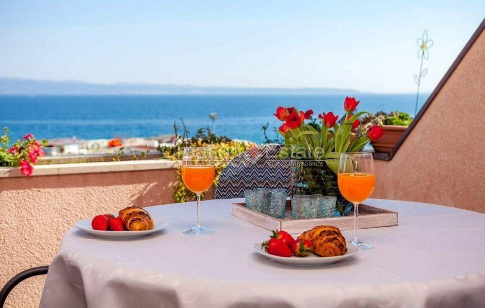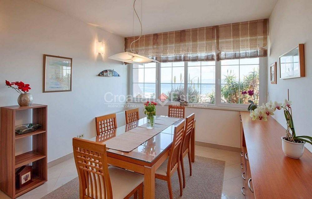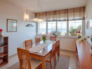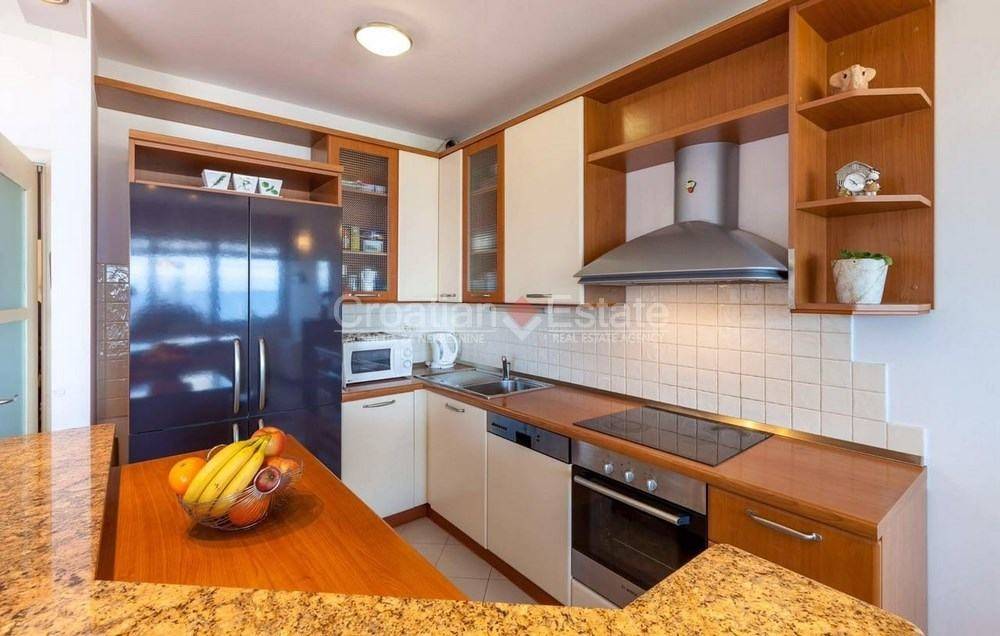 We are renting out a comfortable three-room flat with a living area of 100m2. It is located in a residential building, in the first row to the sea. It consists of a kitchen with a dining room and a living room, three bedrooms, two bathrooms, and a large south-facing loggia with a beautiful sea view. One garage belongs to the property.