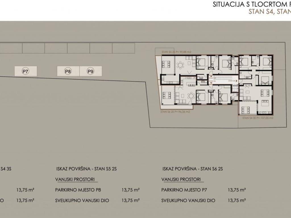 Stan S4 – prvi kat, ukupne površine 107,05 m², sastoji se od: hodnika, dvije kupaonice, tri spavaće sobe, prostranog dnevnog boravka s kuhinjom i blagovaonicom u otvorenom konceptu i natkrivene terase.