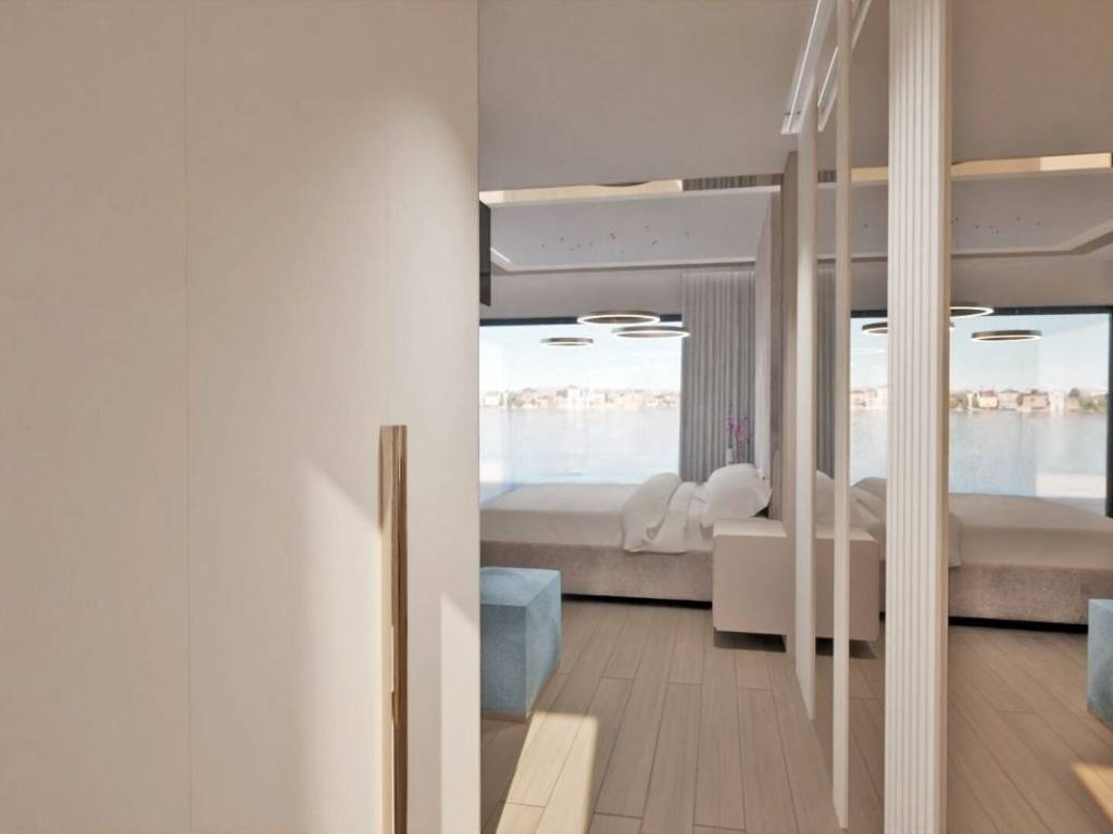 A luxury villa with a stunning panoramic sea view is located in one of the most sought-after locations in Sukošan, in the immediate vicinity of Zadar. An impressive 300 m² of living space is located on a spacious plot of 1020 m², and the carefully designed layout over two floors allows almost every room to enjoy an open view of the sea. All levels of the villa are connected by an elevator – from the garage to the spectacular roof terrace – providing maximum comfort and functionality.   The ground floor exudes elegance and airiness and combines a modern kitchen, dining room and living room with direct access to a large terrace and the Mediterranean ambience of the exterior. On the same floor there is also a relaxation and recreation area that includes a games room, a fully equipped gym with sauna and massage tub, as well as a shower and toilet. An internal staircase with a glass railing further emphasizes the contemporary design and leads to the first floor where there are four spacious bedrooms, each with its own bathroom and access to a covered balcony with an unobstructed sea view. There is also a practical laundry room on the first floor.   A special experience is provided by the roof terrace with a swimming pool, designed as a private oasis for enjoyment, with a planned summer kitchen and a sunbathing area – an ideal place to relax with sunsets. The villa is equipped with underfloor heating and air conditioning via a heat pump, and additional value is provided by two outdoor and two garage parking spaces. The exterior is adorned with a swimming pool, sunbathing area, fireplace, sunken lounge and a carefully landscaped garden with indigenous Dalmatian horticulture. The property is under video surveillance and provides complete privacy and security.   In the immediate vicinity there are top restaurants, shops and all necessary amenities, while the proximity of the natural beach makes this villa the perfect choice for a luxurious summer home or investment in an exceptional location.