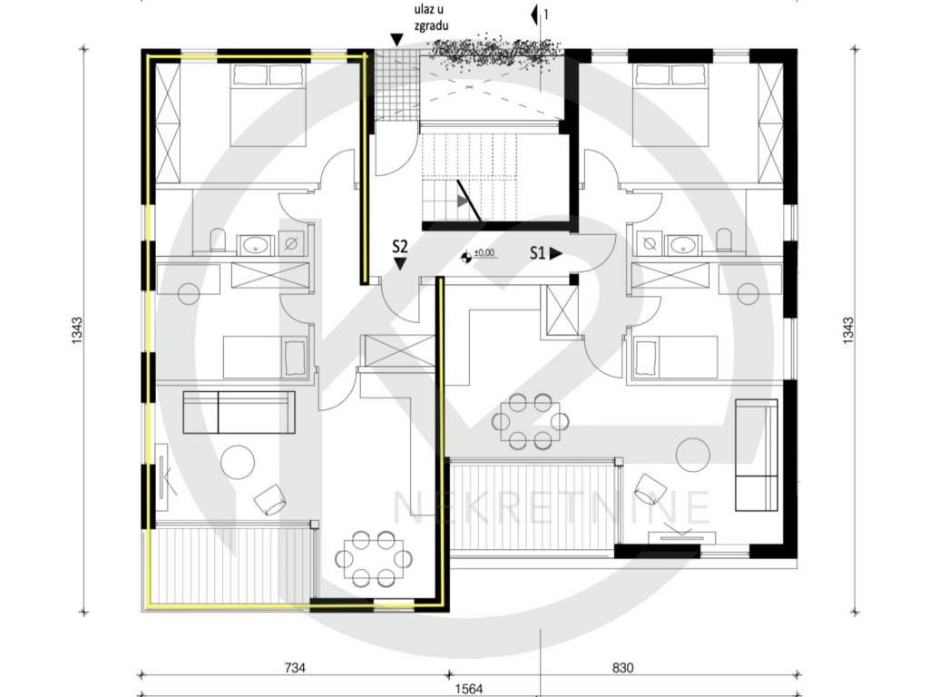 Predmetni stan oznake S2 se nalazi u visokom prizemlju (visina prvog kata) se sastoji od ulaznog prostora, kupaonice sa WC-om, veće spavaće sobe, manje spavaće sobe, dnevnog boravka sa kuhinjom i blagovaonicom i loggie.