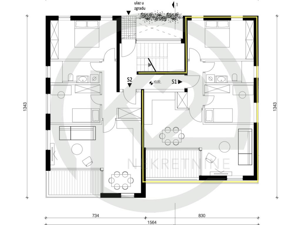Predmetni stan oznake S1 se nalazi u visokom prizemlju (visina prvog kata) se sastoji od ulaznog prostora, kupaonice sa WC-om, veće spavaće sobe, manje spavaće sobe, dnevnog boravka sa kuhinjom i blagovaonicom i loggie.