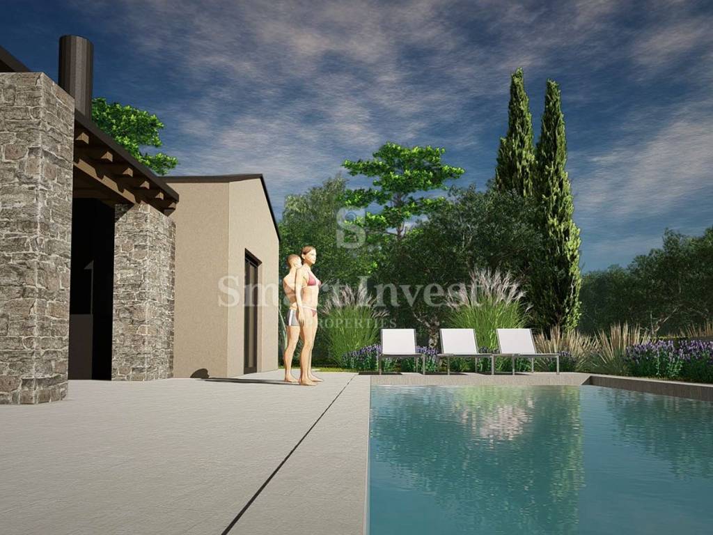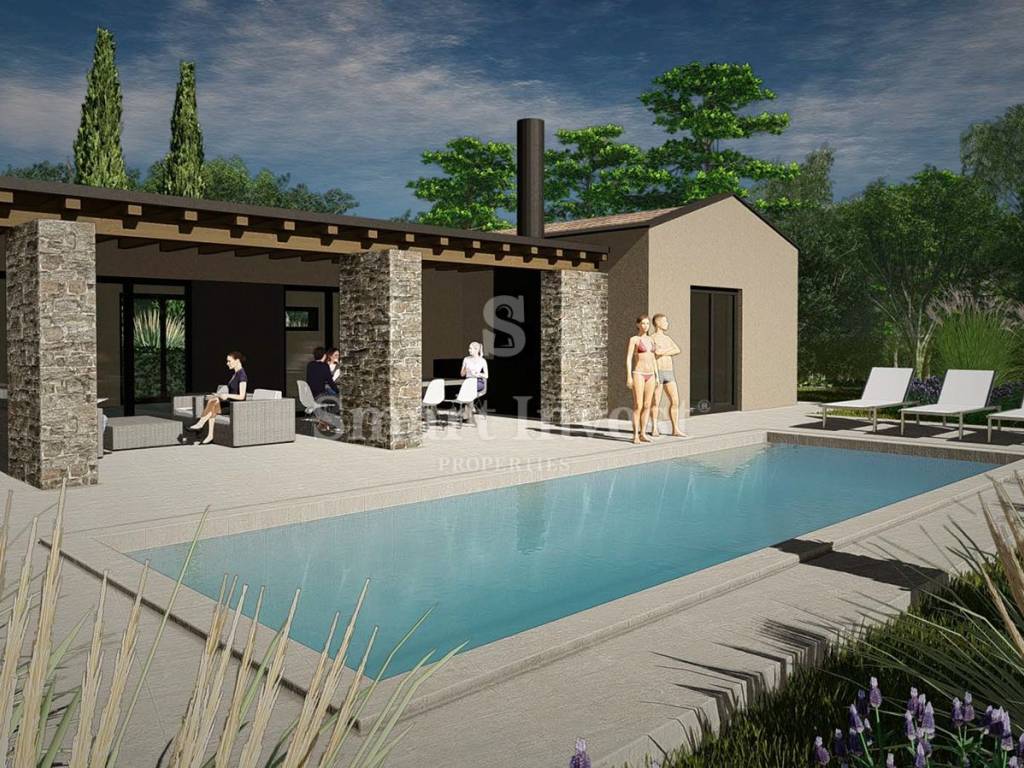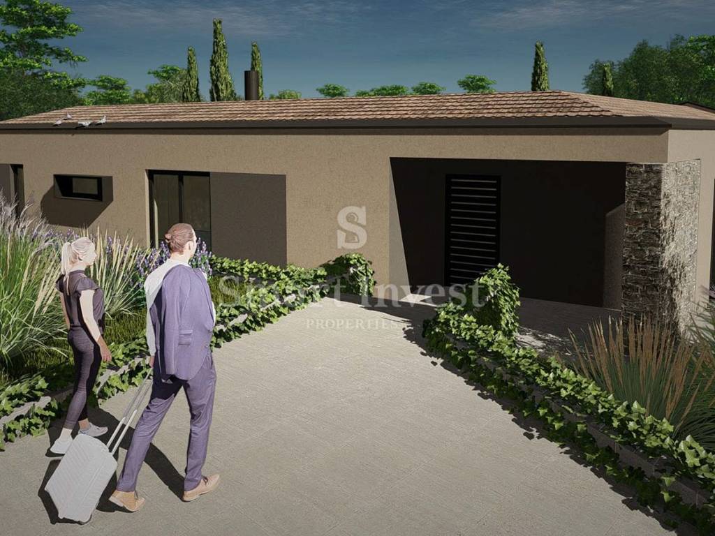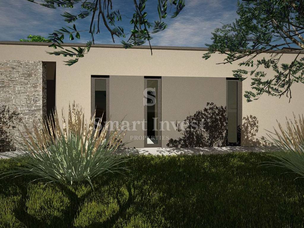 Na prodaju je građevinsko zemljište koje dolazi s izrađenim idejnim projektom za modernu kuću mediteranskog stila. Projekt spaja suvremenu arhitekturu s tradicionalnim elementima koristeći prirodne materijale poput kamena, drva i betona. Velike staklene površine i jednostavne linije osiguravaju puni vizualni kontakt interijera s krajolikom i planiranim bazenom.