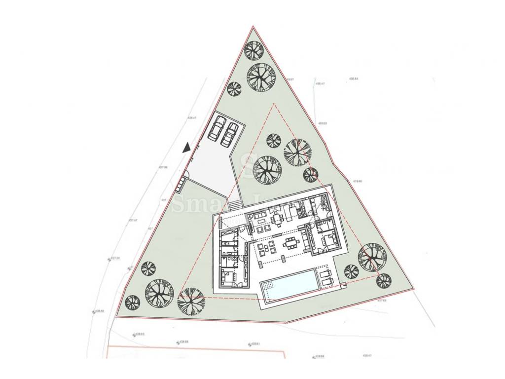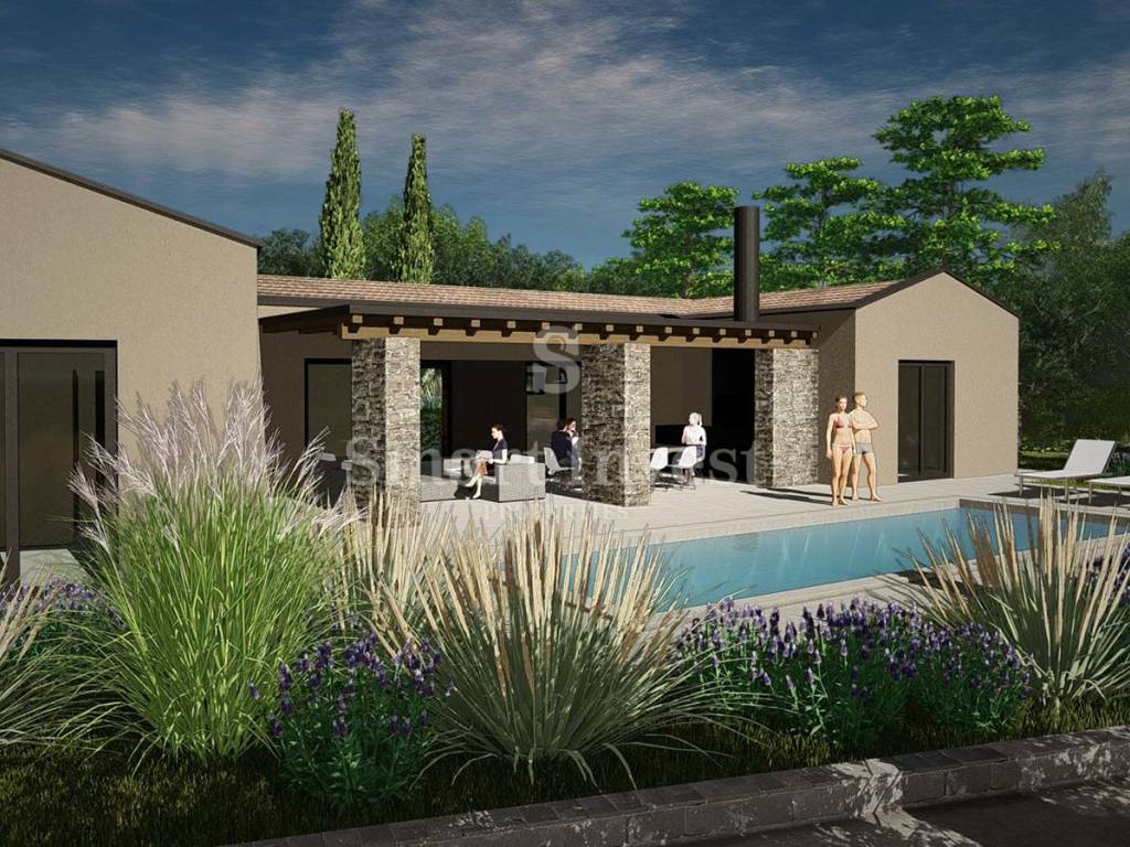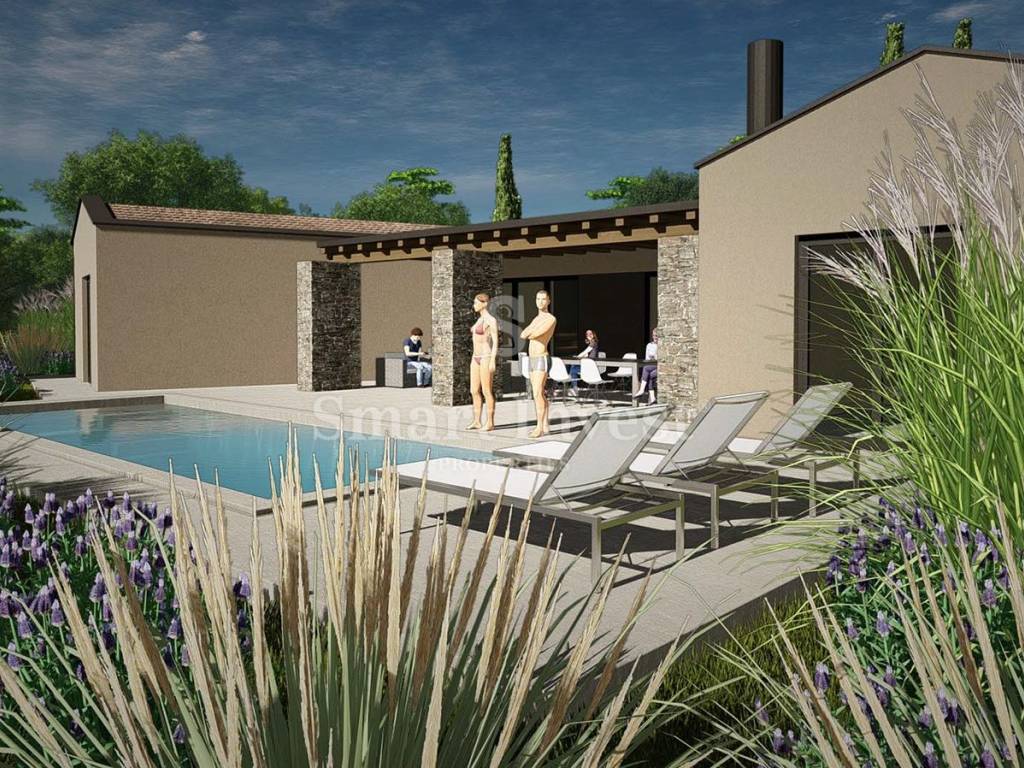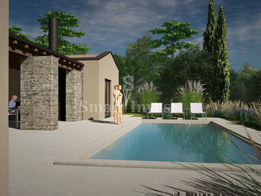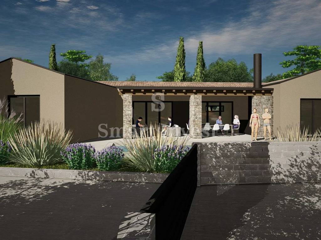 Na prodaju je građevinsko zemljište koje dolazi s izrađenim idejnim projektom za modernu kuću mediteranskog stila. Projekt spaja suvremenu arhitekturu s tradicionalnim elementima koristeći prirodne materijale poput kamena, drva i betona. Velike staklene površine i jednostavne linije osiguravaju puni vizualni kontakt interijera s krajolikom i planiranim bazenom.