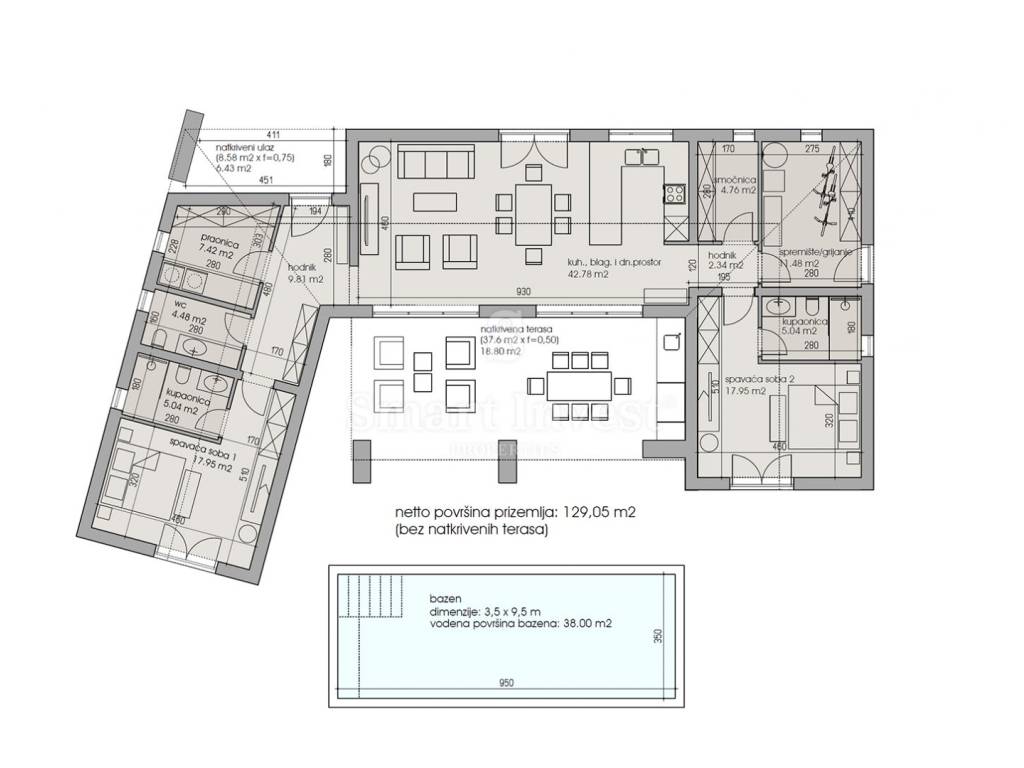 Velike klizne stijene otvaraju se prema natkrivenoj terasi i bazenu