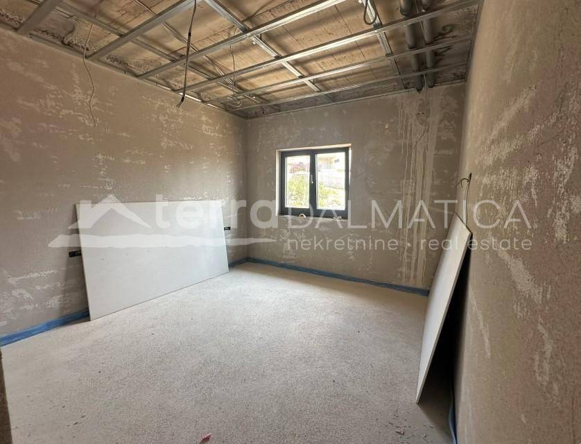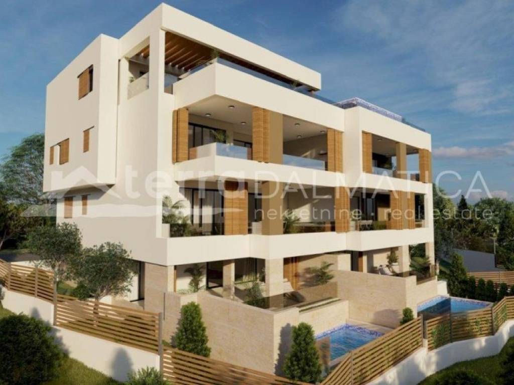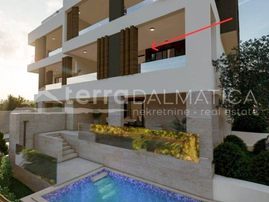 It is our pleasure and honor to present a new project with luxury apartments in Primosten. A modern look, top-quality materials and equipment, and a breathtaking view are the advantages that make this project special. The building, which is currently under construction, consists of seven residential units distributed over four above-ground floors, as well as garages and storage rooms located in the basement. Completion of the works and occupancy is expected in 2025. Apartment S4 is located on the first floor. It consists of an open concept kitchen, dining room and living room, two bedrooms, one of which has its own bathroom, and an additional bathroom. From the living room there is access to a spacious loggia and a terrace with hot tub. The apartment has one garage space and a storage room in the basement, and one outdoor parking space. All apartments will be equipped with burglar-proof doors, video surveillance, high-quality ALU carpentry with blinds on electric lifters, underfloor heating with a heat pump. The apartments on the ground floor have an outdoor pool, and the other apartments have hydromassage pools (jacuzzi) on the balconies. The building will also have a built-in elevator. Primosten is a beautiful Dalmatian place, the pearl of the Adriatic. It is known for its long, pebbly beaches and characteristic narrow streets in the old town, as well as numerous catering and tourist facilities. Due to its proximity to the marina, it is also an excellent choice for boaters. It is located near the cities of Split and Sibenik, and the airport is only 40 kilometers away. Contact our agent and schedule your tour. Note: Renderings are used in the ad.