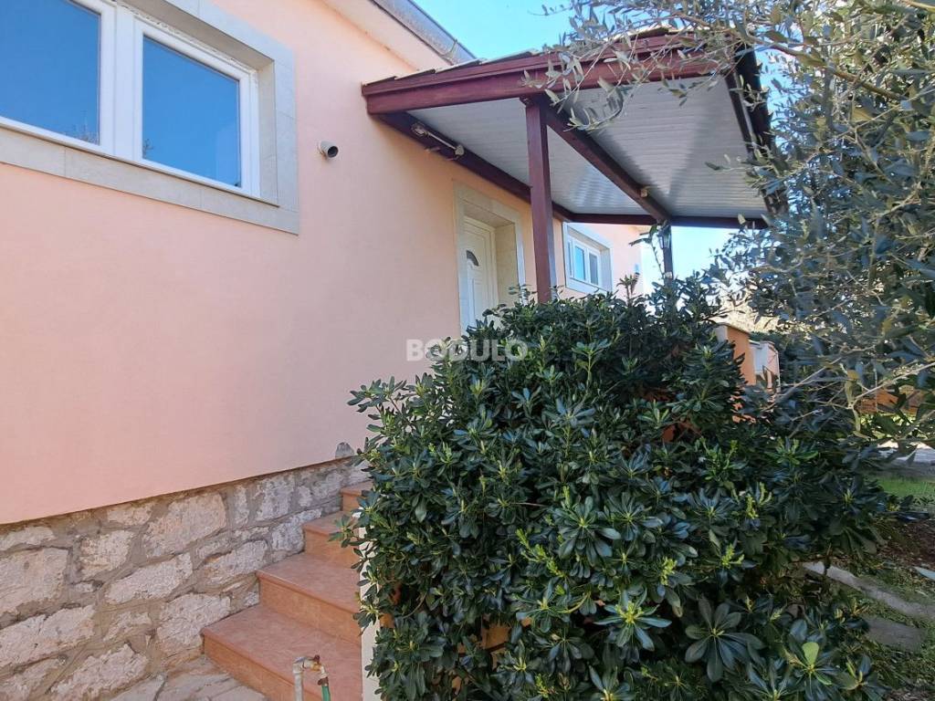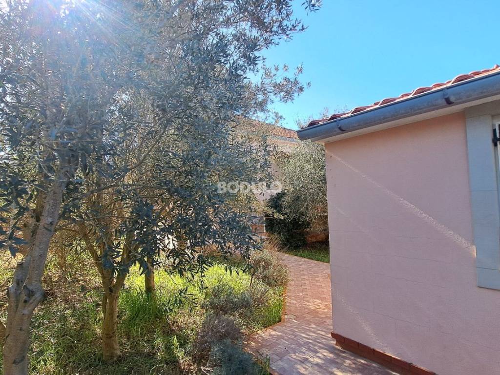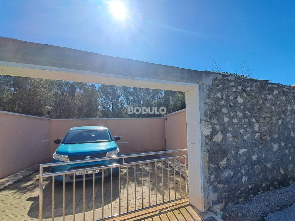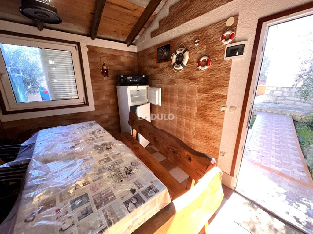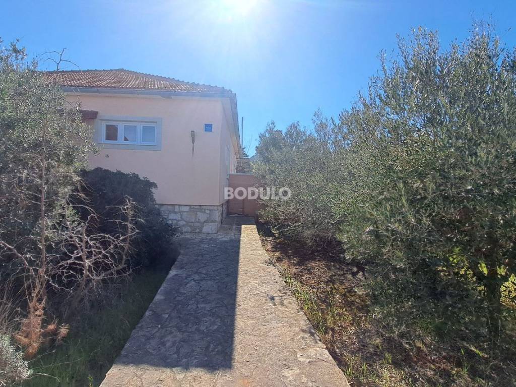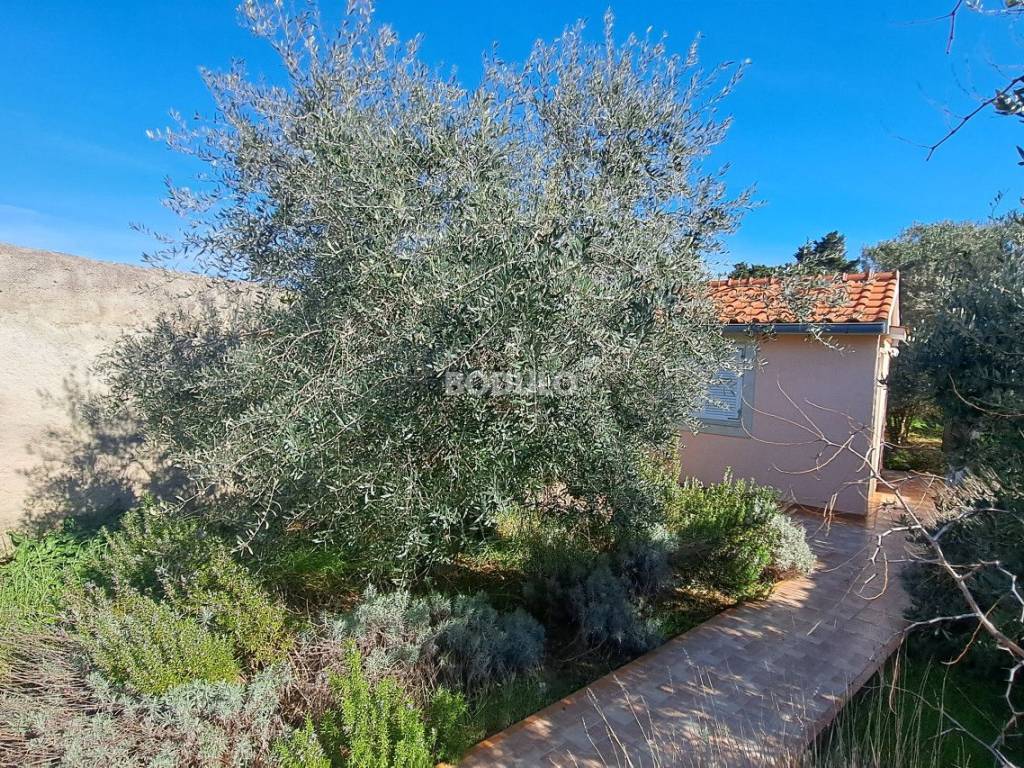 In a nice and quiet part of Ugljan, there is this family house located in the first row from the sea, living area of 92 m2. The house is located within a semi-detached building, and it is decorated with a beautifully landscaped garden of 643 m2, planted with olive and citrus trees, and Mediterranean herbs (rosemary, lavender). In the yard, there is an auxiliary building with a summer kitchen and a storage room, as well as two arranged parking spaces. The property is located in a truly unique location, only 7 meters from the sea, and the access road leading to the property is closed to traffic in the summer months (except for residents of this part of the village), which certainly contributes to a peaceful and relaxing atmosphere. The house consists of a living room, kitchen and dining room, two spacious bedrooms, hallway and bathroom, and a covered terrace with an open view of the sea. The property has its own connection to electricity, city water and sewage, while the water tank is common to the entire building (detached house). The total area of the land on which the house is located is 735 m2. The property is about 250 meters from the center of Ugljan, where there are shops, restaurants, a post office, a doctor, a hair salon, a mini-football, basketball and children's playground, etc.