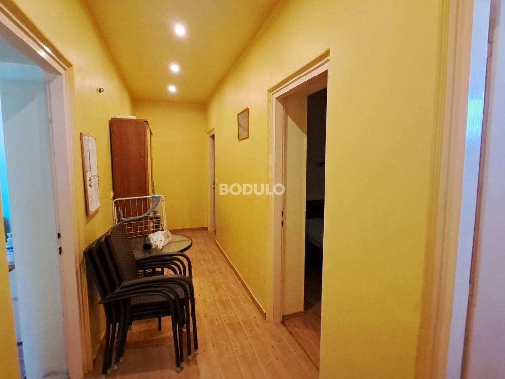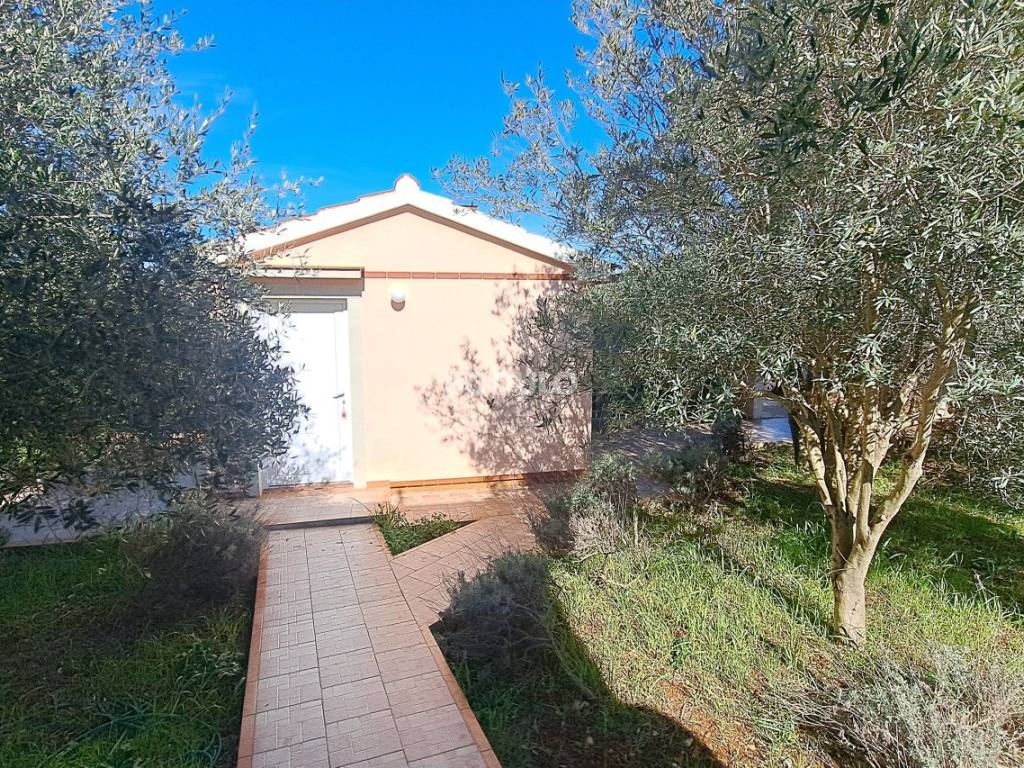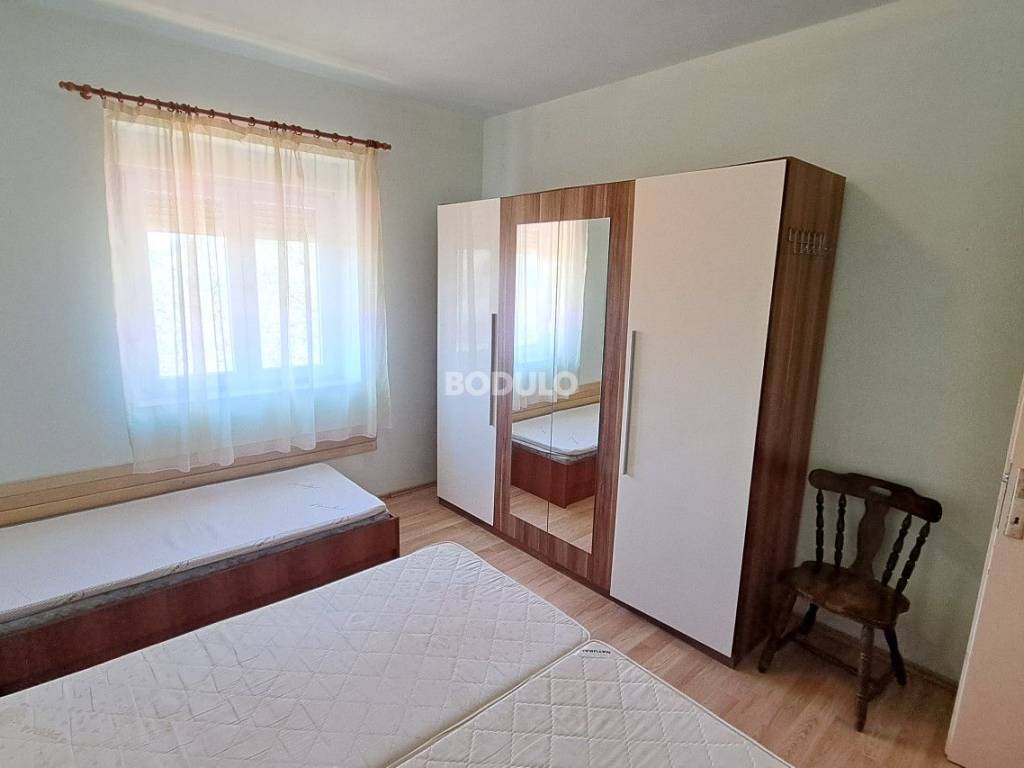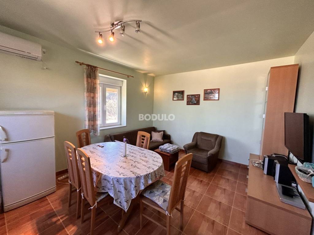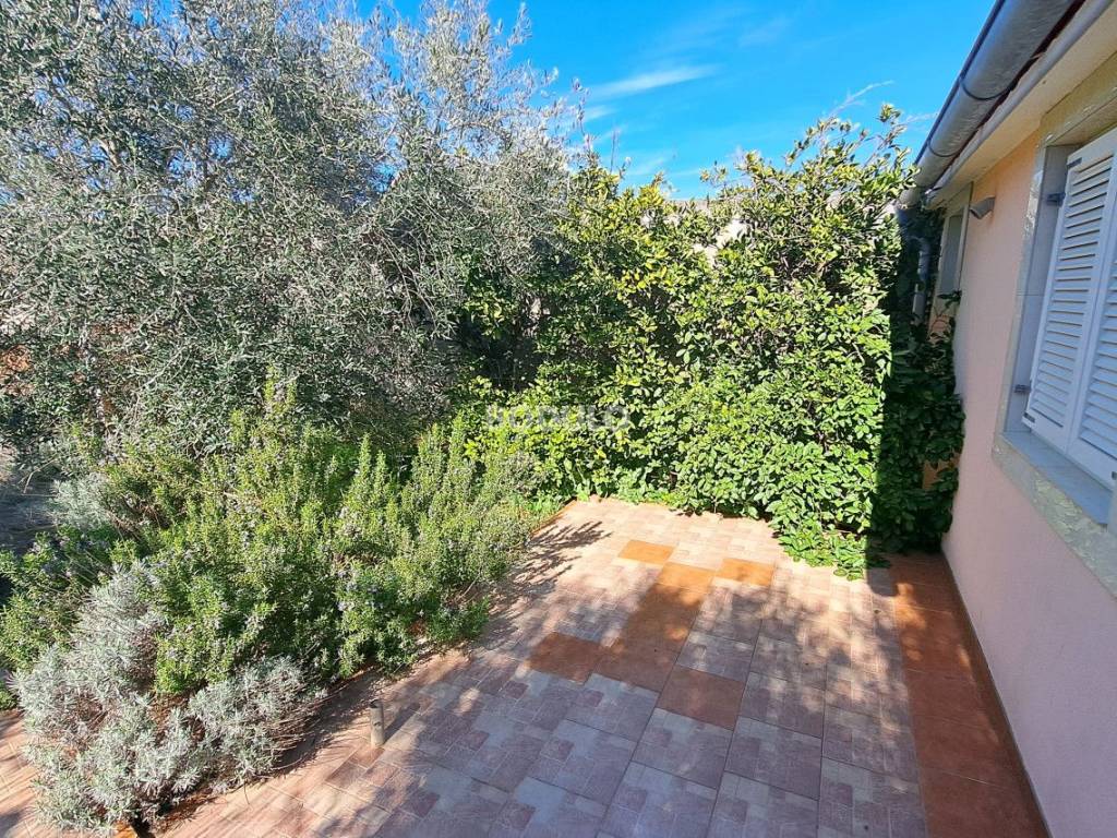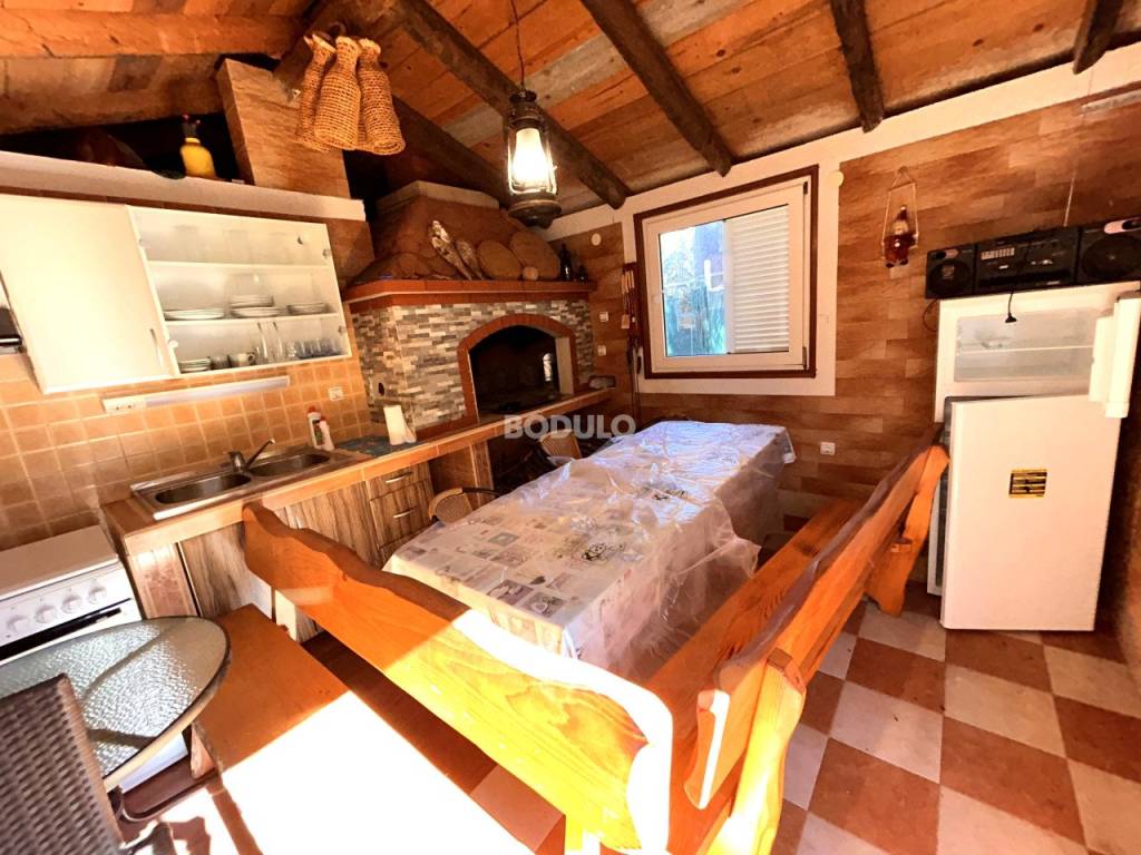 In a nice and quiet part of Ugljan, there is this family house located in the first row from the sea, living area of 92 m2. The house is located within a semi-detached building, and it is decorated with a beautifully landscaped garden of 643 m2, planted with olive and citrus trees, and Mediterranean herbs (rosemary, lavender). In the yard, there is an auxiliary building with a summer kitchen and a storage room, as well as two arranged parking spaces. The property is located in a truly unique location, only 7 meters from the sea, and the access road leading to the property is closed to traffic in the summer months (except for residents of this part of the village), which certainly contributes to a peaceful and relaxing atmosphere. The house consists of a living room, kitchen and dining room, two spacious bedrooms, hallway and bathroom, and a covered terrace with an open view of the sea. The property has its own connection to electricity, city water and sewage, while the water tank is common to the entire building (detached house). The total area of the land on which the house is located is 735 m2. The property is about 250 meters from the center of Ugljan, where there are shops, restaurants, a post office, a doctor, a hair salon, a mini-football, basketball and children's playground, etc.