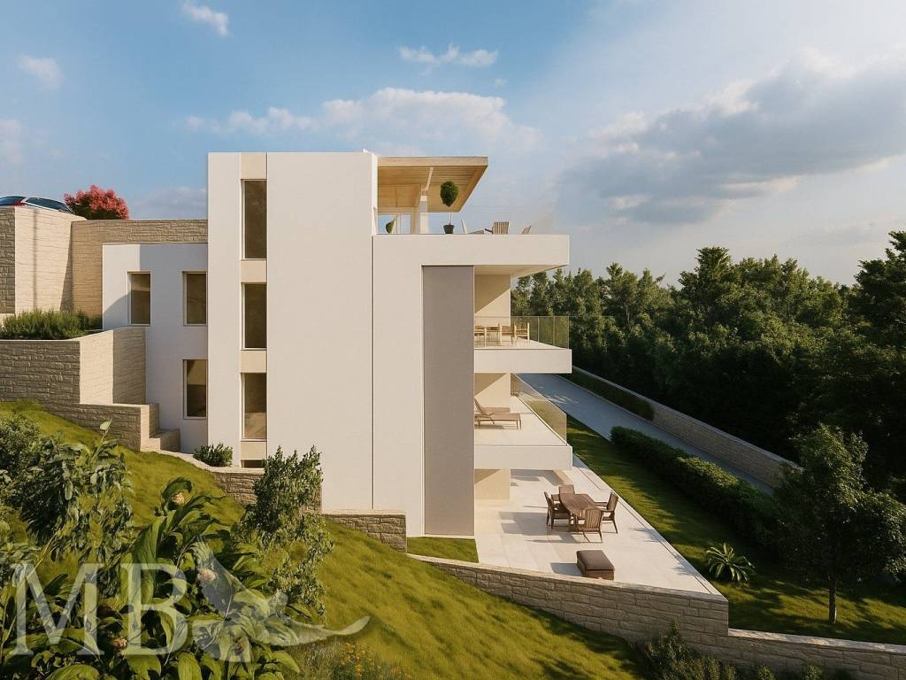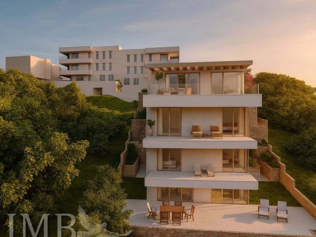 CIJENA NA UPIT. Atraktivno građevinsko zemljište s pogledom na more, orkuženo zelenilom, s idejnim projektom za stambeno-poslovnu zgradu i svom infrastrukturom u blizini idealna prilika za investiciju ili gradnju modernih stanova i apartmana.