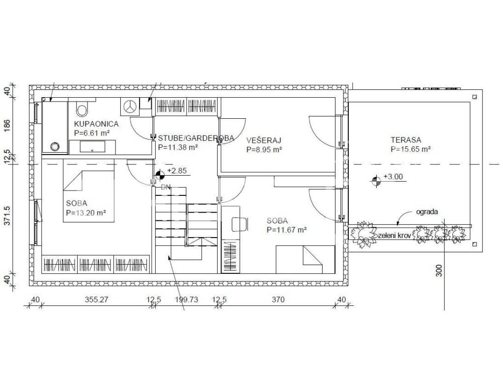 Prema projektu, u prizemlju su predviđeni hodnik, stubište, jedna spavaća soba s kupaonicom, dodatni wc, tehnička prostorija te dnevni boravak s kuhinjom i blagovaonicom s izlazom na vrt. Na katu se nalaze dvije spavaće sobe, kupaonica, hodnik s ugradbenim ormarima, vešeraj i terasa. Ako je potrebno, umjesto vešeraja može se dobiti i četvrta spavaća soba.