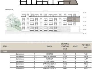 Sastoji se od ulaznog hodnika, kuhinje s blagovaonicom i dnevnog boravka, 3 spavaće sobe, 2 kupaonice i loggie. Uz stan je potrebno kupiti garažno mjesto i spremište.