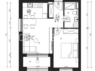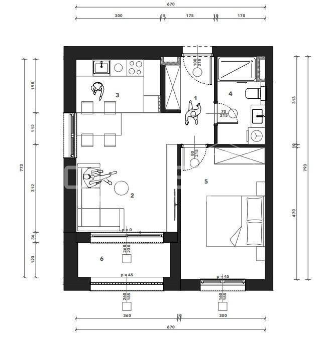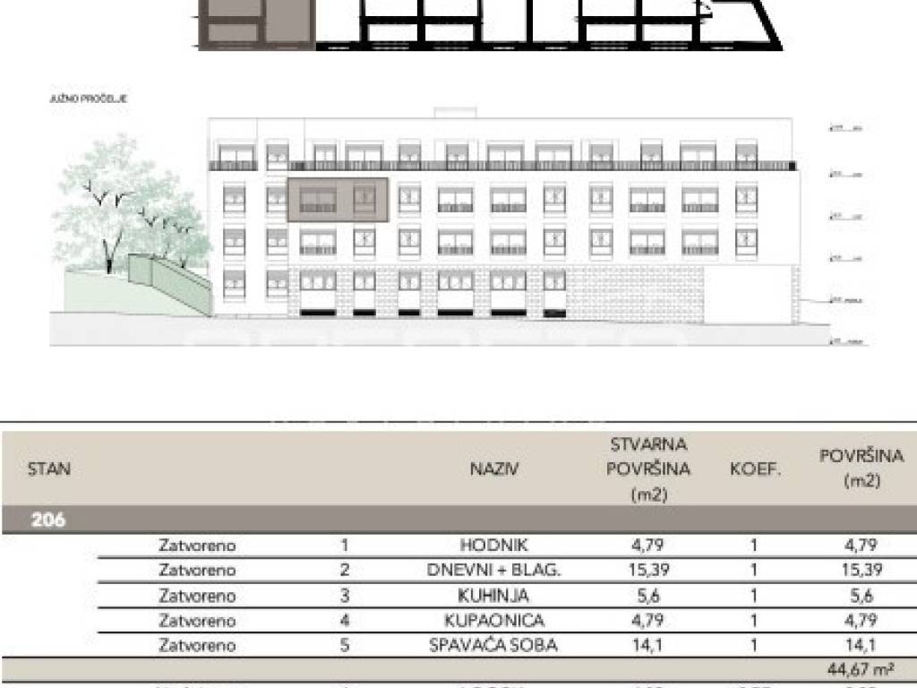 Sastoji se od ulaznog hodnika, kuhinje s blagovaonicom i dnevnog boravka, spavaće sobe, kupaonice i loggie. Uz stan je potrebno kupiti garažno mjesto i spremište.