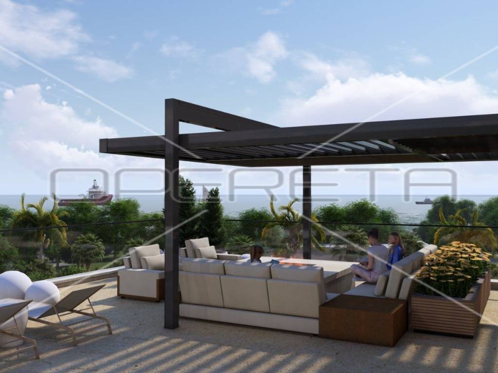 The open-concept kitchen with dining area and living room perfectly connect with the loggia. The penthouse has access to a rooftop terrace where a jacuzzi and social area are planned.