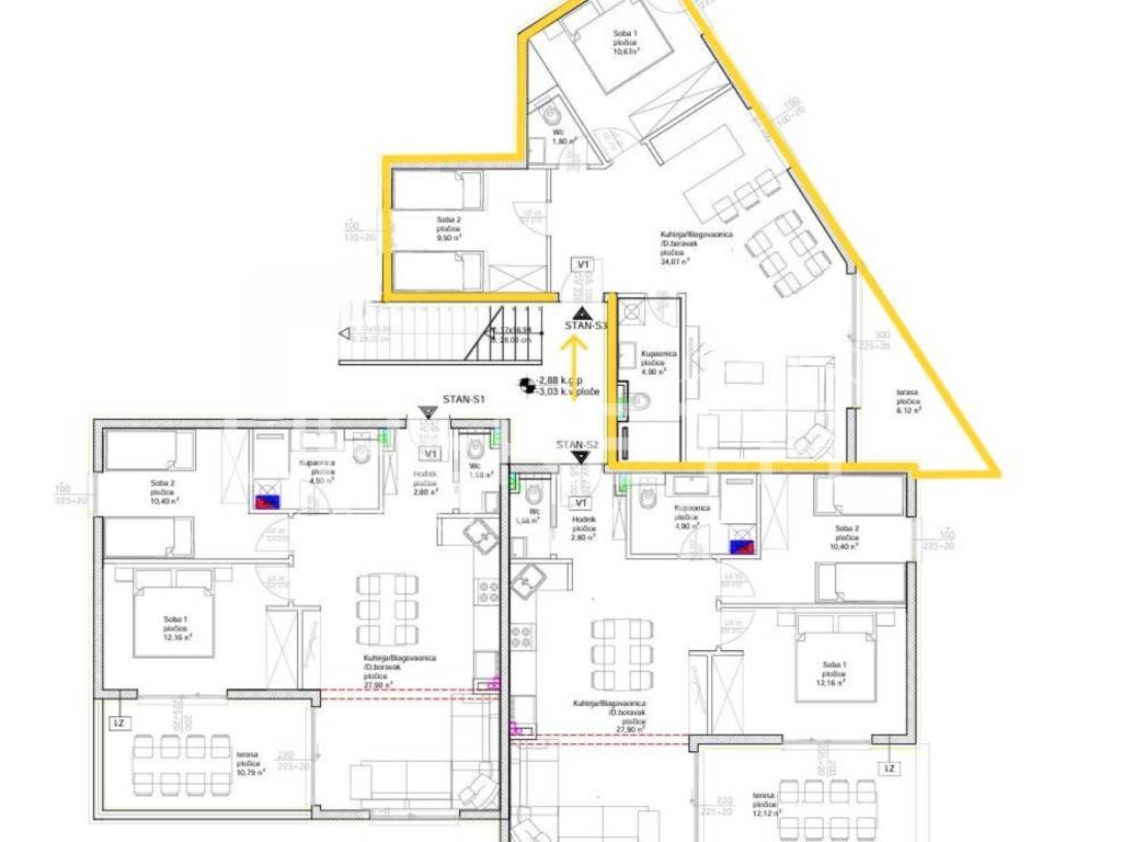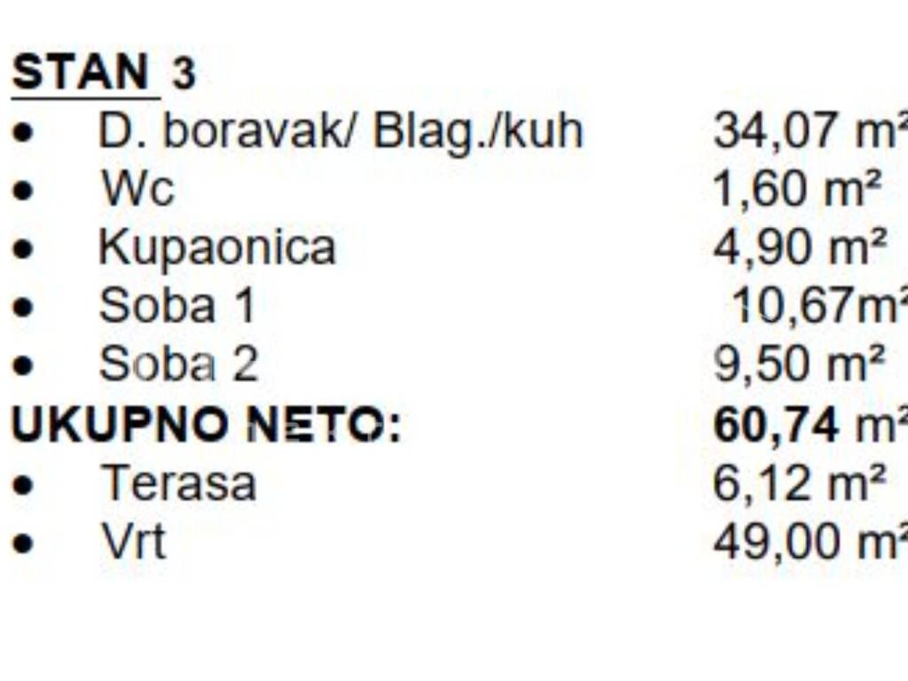 Apartment S3 is located on the ground floor and covers 60.74 m of carefully designed living space, consisting of an guest toilet, bathroom, spacious living room connected with the kitchen, two bedrooms, and a 6,12 m terrace (coefficient 0.50 = 3.06 m) and a garden 49m2 (coefficient 0,25 = 11,25m2) perfect for unwinding.