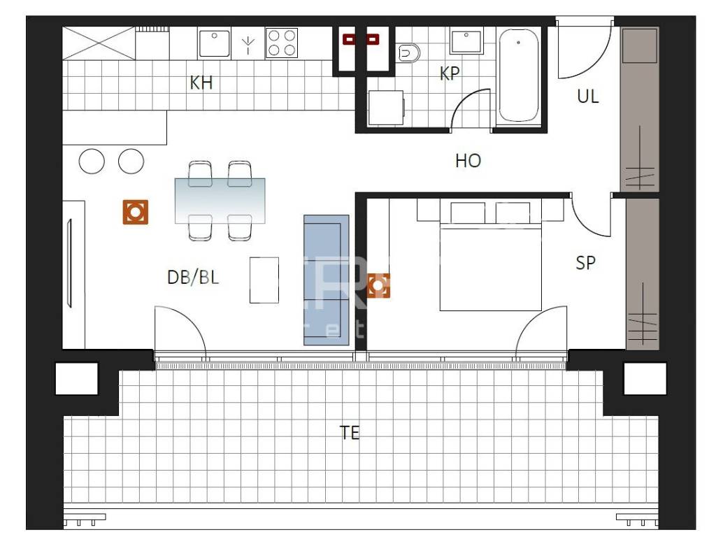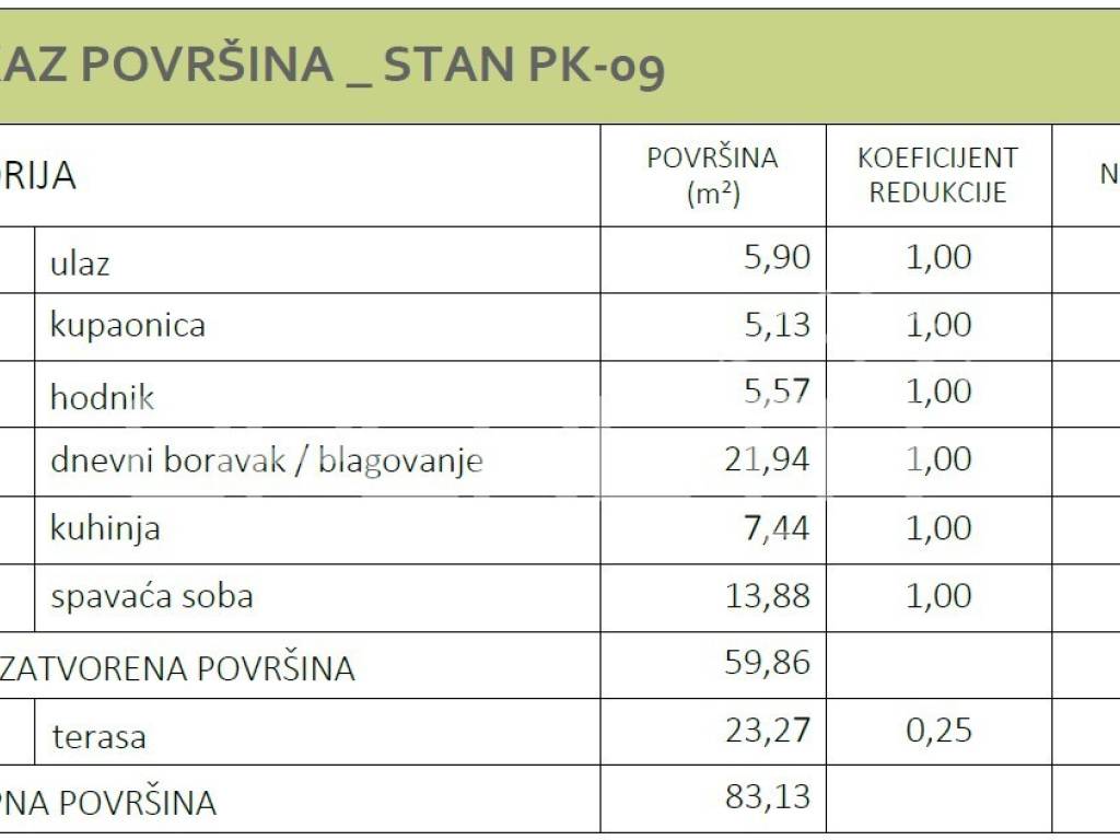Prostrani dvosoni stan sastoji se od spavaće sobe, kupaonice, hodnika, dnevnog boravka s kuhinjom i blagovaonicom, terase.