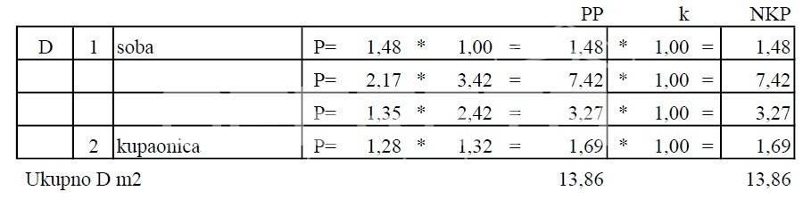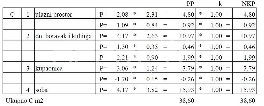 Dvosobni stan površine 38,60 m s pripadajućim spremištem u podrumu (8,67 m / neto korisne površine 4,34 m), ukupne podne površine 47,27 m (neto korisne 42,94 m).
