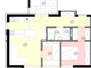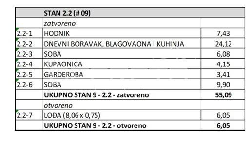 Stan oznake S9 nalazi se na drugom katu stambene zgrade u izgradnji od ukupno 2 kata. Sastoji se od velikog "open space" dnevnog boravka s kuhinjom i blagovaonicom te izlazom na lođu, 2 sobe, kupaonice s wc-om, zasebne garderobe i hodnika.