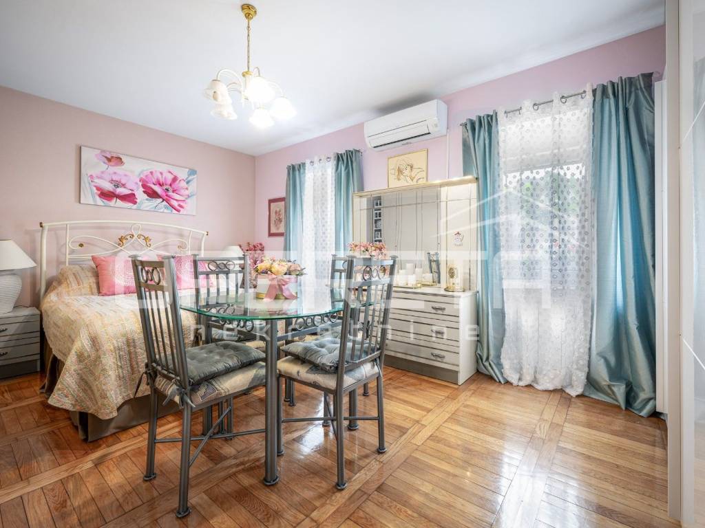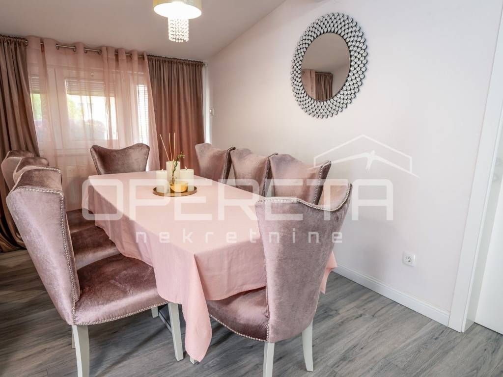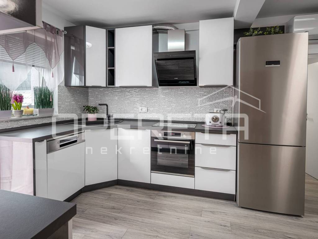 Svaka stambena jedinica ima vlastitu kuhinju (nove kuhinje izrađene po mjeri), blagovaonicu, dnevni boravak, spavaće sobe i kupaonicu, što omogućuje potpunu funkcionalnu neovisnost. Terasa na katu, površine 45 m2, zamišljena je kao produžetak dnevnog prostora, s priključkom za vodu i mogućnošću ugradnje roštilja i vanjske kuhinje. Ukupno, kuća ima šest soba, tri kupaonice u stambenom dijelu te dodatnu kupaonicu u poslovnom prostoru.