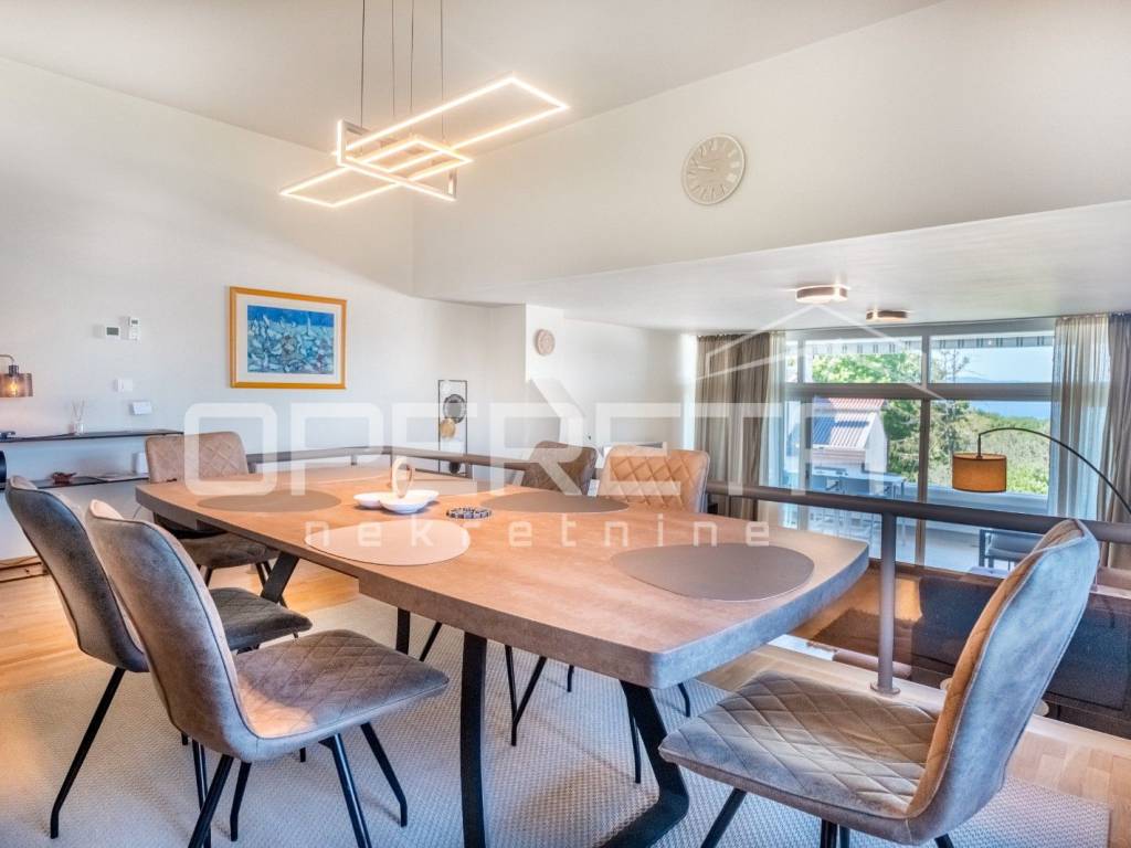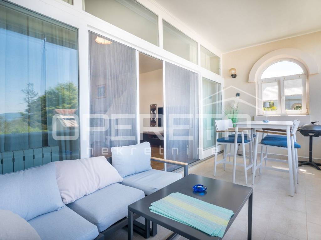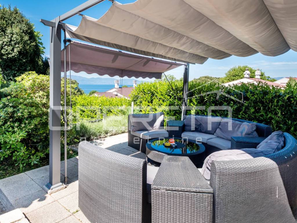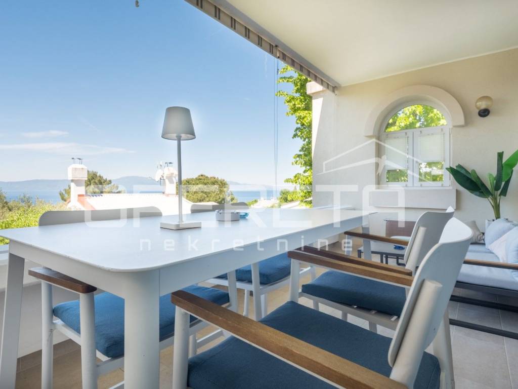 Designed by a renowned architect, the house blends harmoniously with its Mediterranean surroundings. An open view of the Kvarner Bay extends from almost every room. The functional layout includes a spacious living room with a fireplace and dining area, a fully equipped kitchen, an additional auxiliary kitchen, three bedrooms, two bathrooms, a separate guest toilet, a storage room and a large garage.