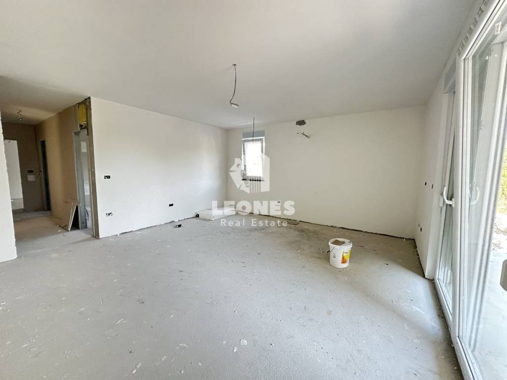 The apartment consists of an entrance hall, a living room with a kitchen and a dining room, and two spacious bedrooms, as well as a storage room on the ground floor of the building of 3.58 m2. The apartment also has a yard of 280 m2.