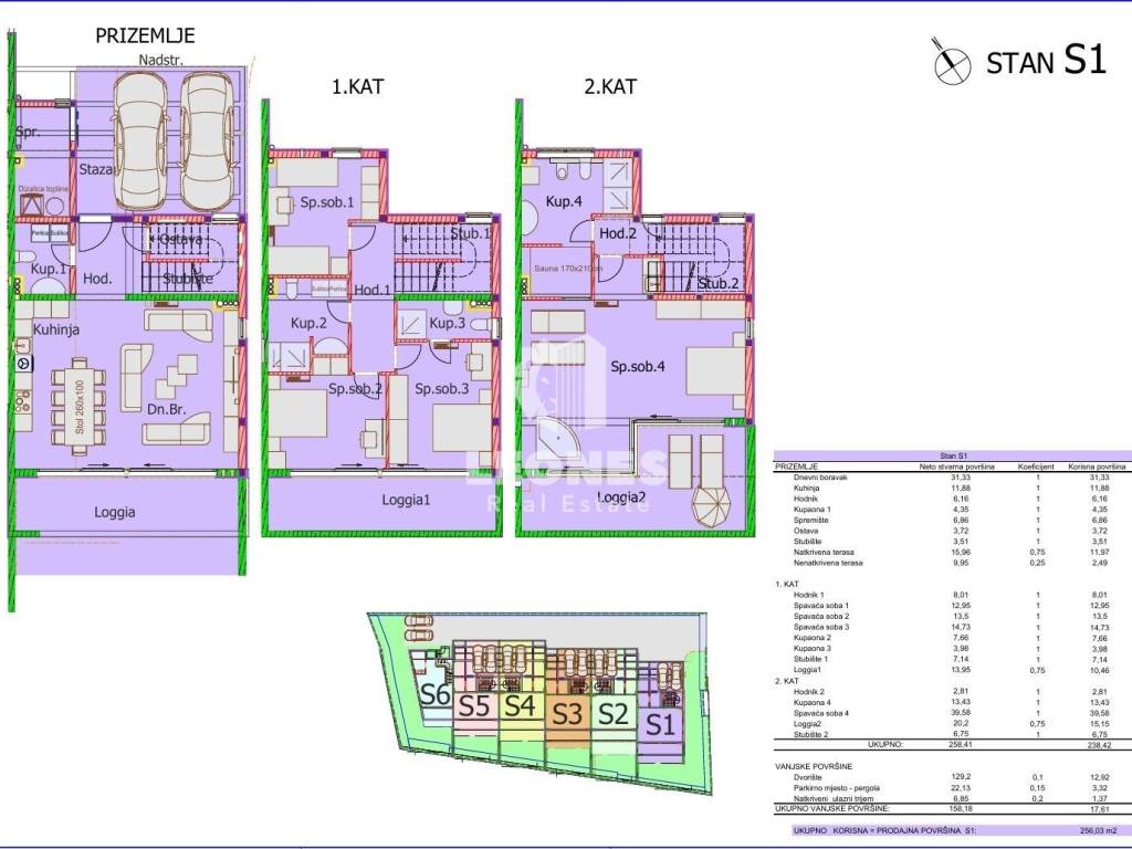 A terraced house 200m from the sea and beach near Umag is for sale. The house has a sea view and is in a great location. The net usable area is 256 m2 and extends over three floors. It extends over three floors. The ground floor has a spacious living room with a kitchen, bathroom, storage room and an outdoor covered loggia and an uncovered terrace with access to the yard. The outdoor storage room also allows for bicycle storage. In front of each entrance there is a parking space for two vehicles with a pergola. An outdoor barbecue can be installed on the terrace and preparations for an outdoor jacuzzi can be made (it can also be mounted if desired).