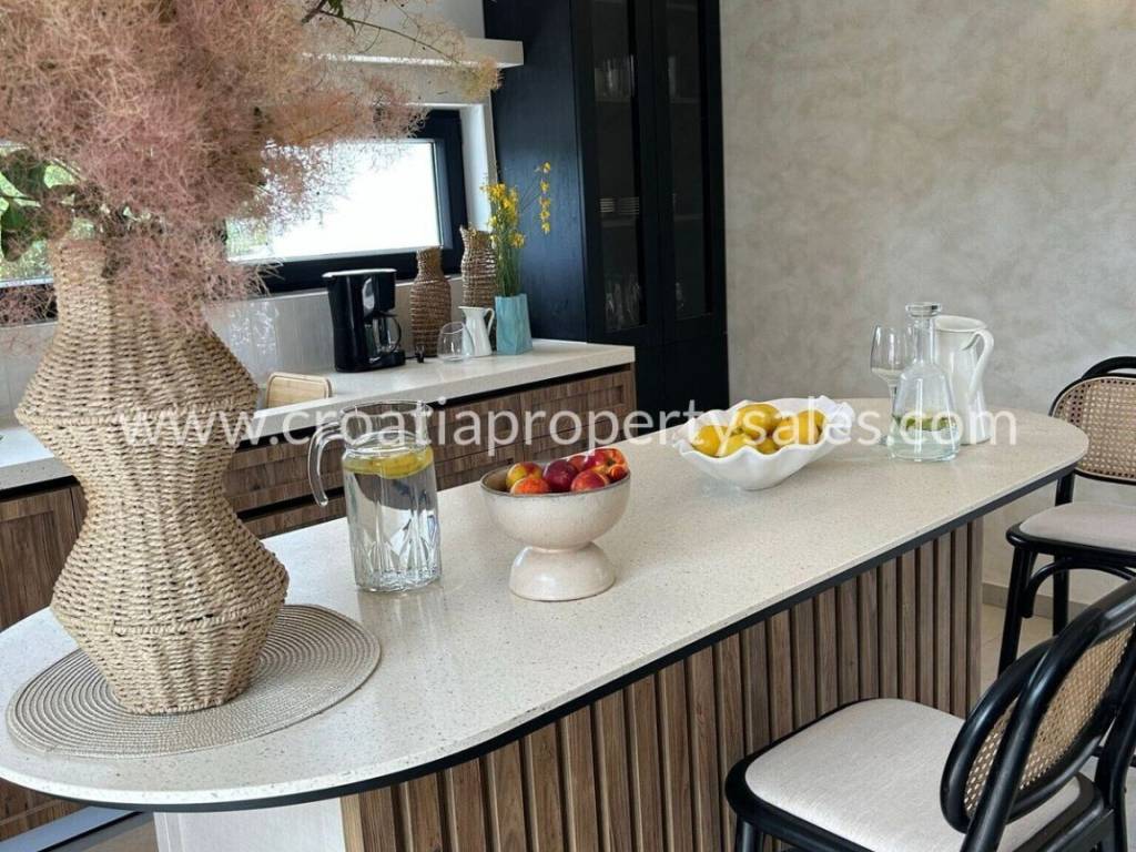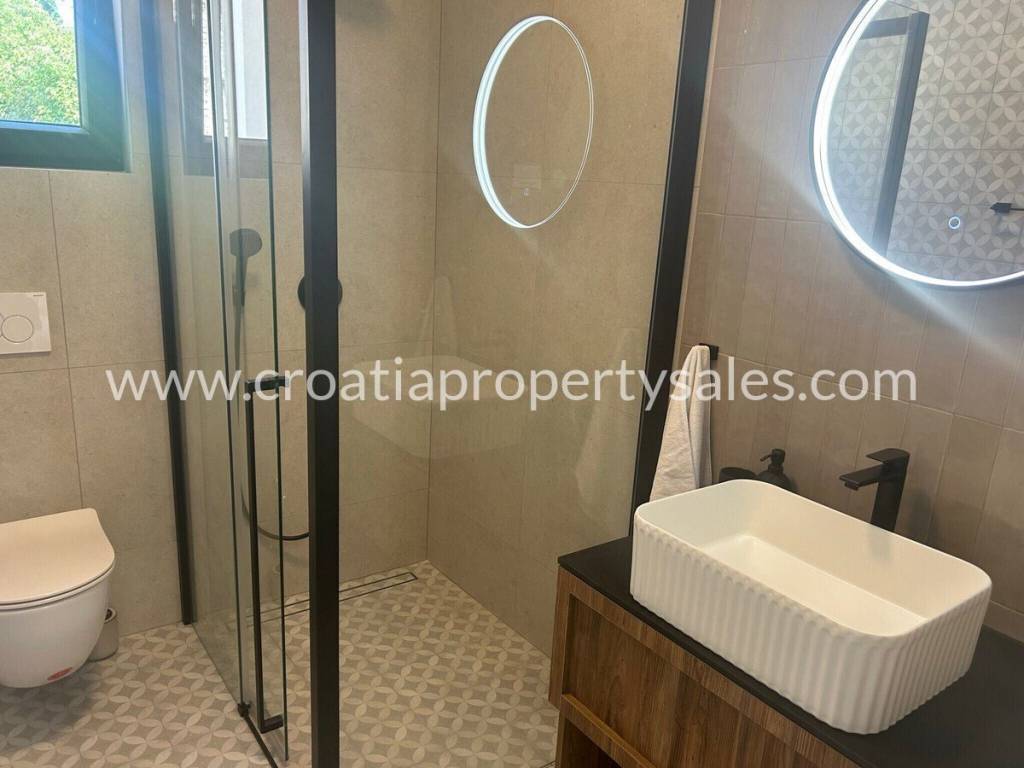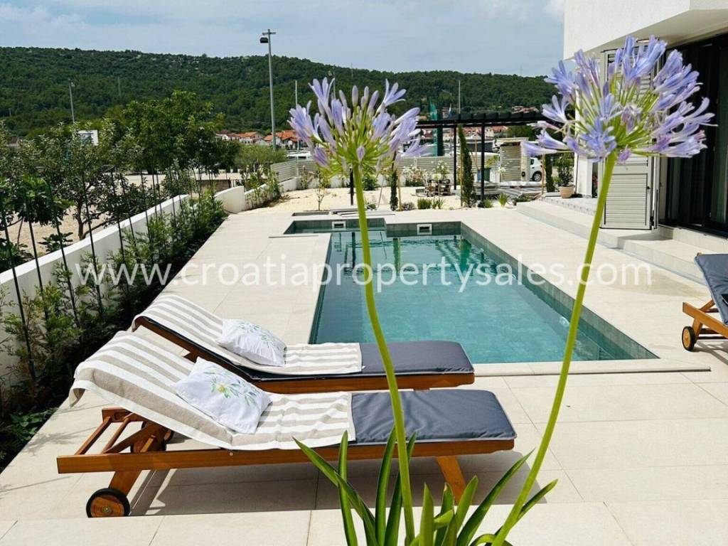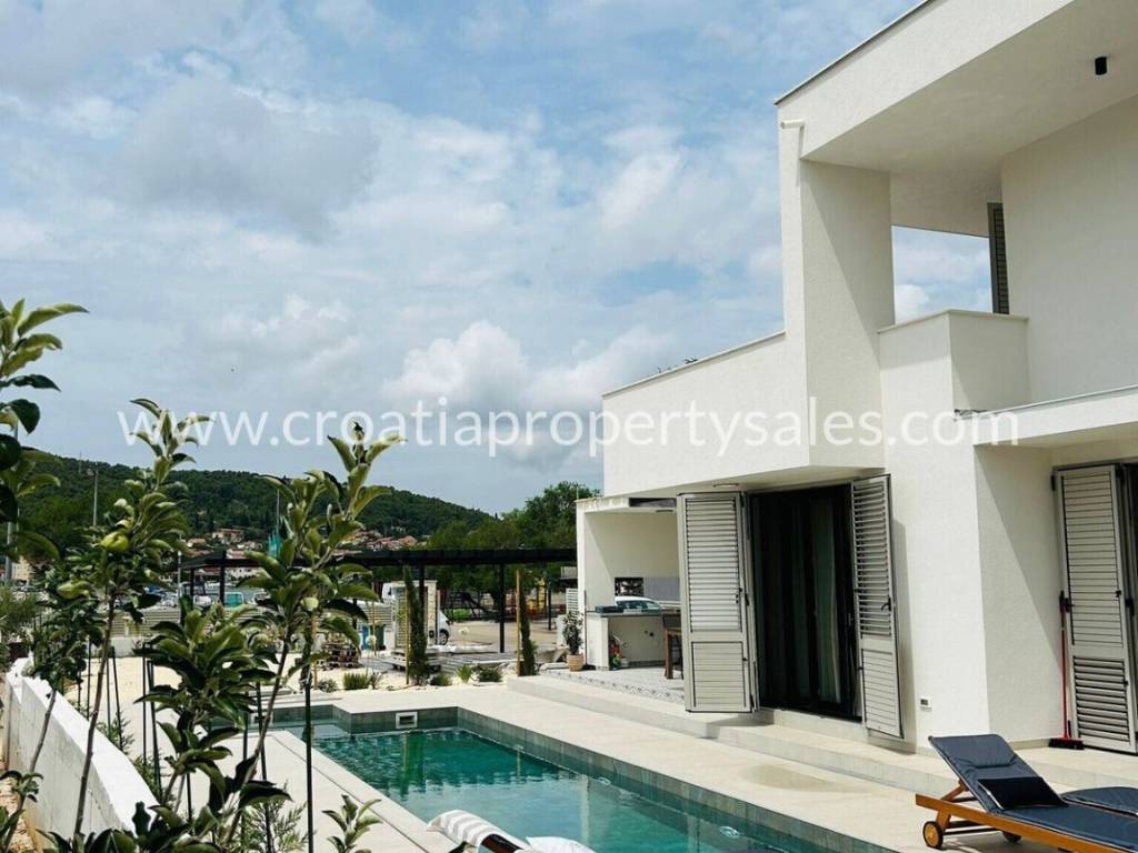Newly built villa with a swimming pool in the first row to the sea in a quiet bay 10 minutes from Sibenik centre. It consists of two floors and a spacious garden. The ground floor has a kitchen, dining room, living room, storage/technical room, bathroom and one bedroom. On the first floor there are three bedrooms. An en-suite master bedroom with a walk-in wardrobe and private terrace, two further bedrooms share a common bathroom and each room has its own balcony. Outside there is a covered summer kitchen with a traditional built-in BBQ, swimming pool and covered parking area. There are six air conditioning units, floor heating and solar systems. The villa has excellent rental potential and is currently rented until the beginning of April so cannot be viewed inside during this time. (serious buyers please enquire). The villa was finished in June 2024. The price is fixed.