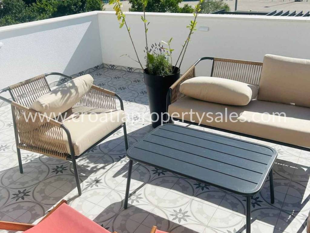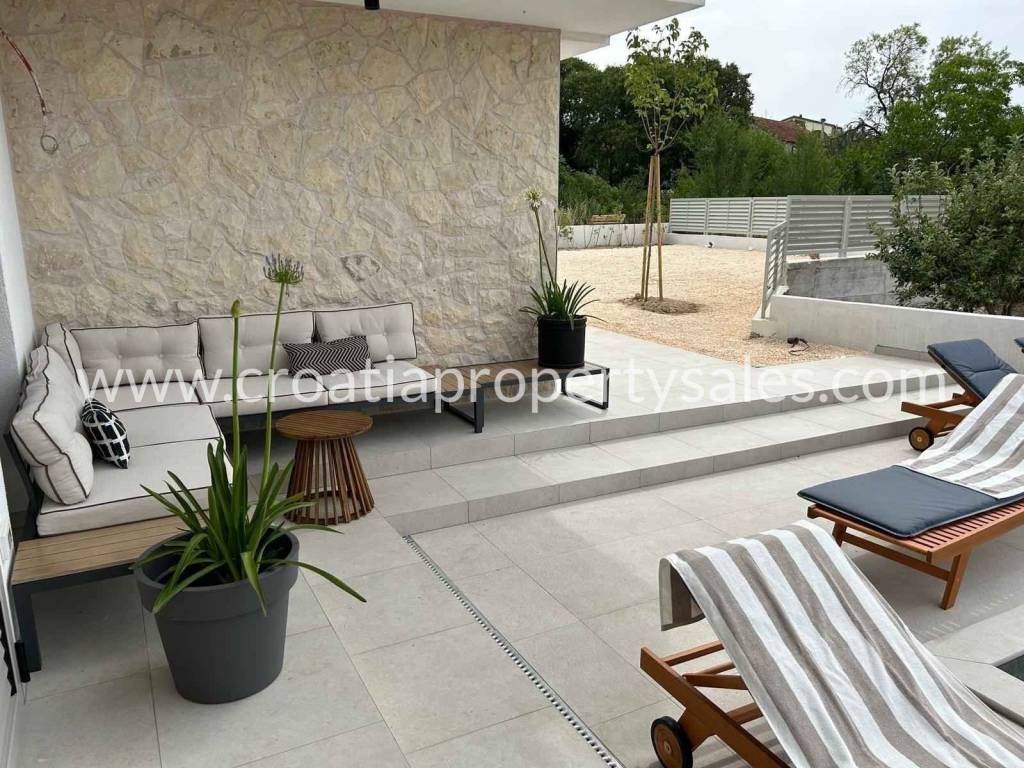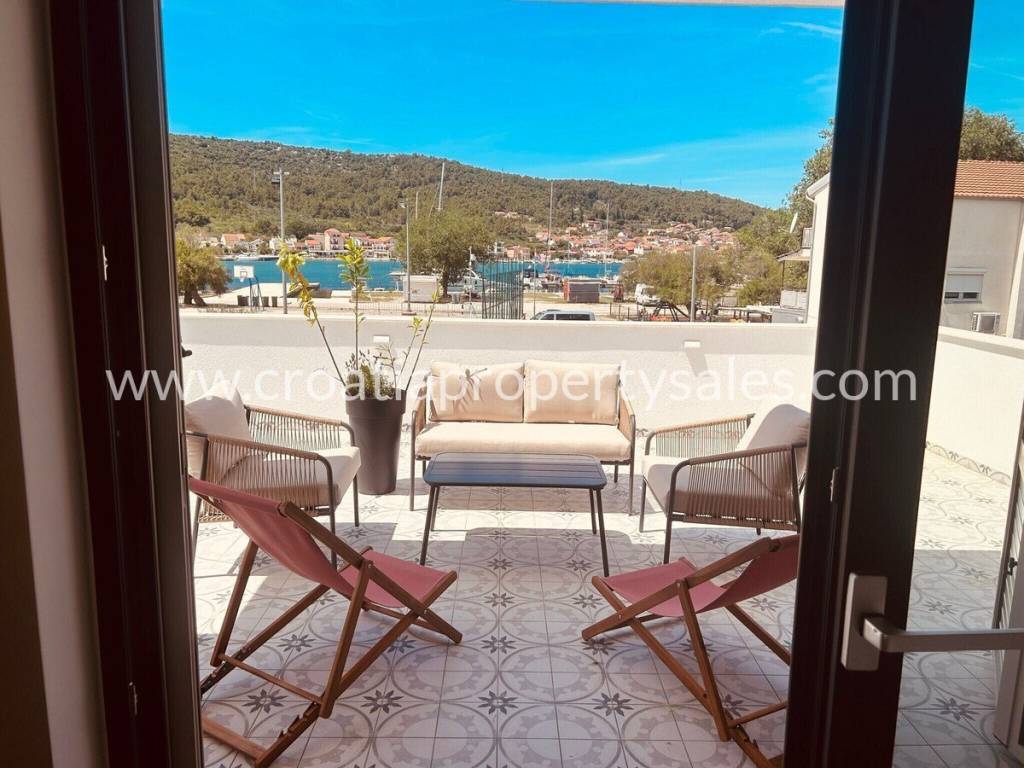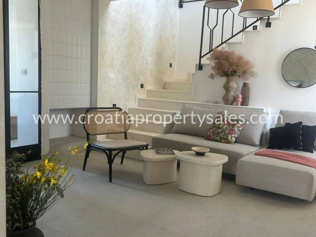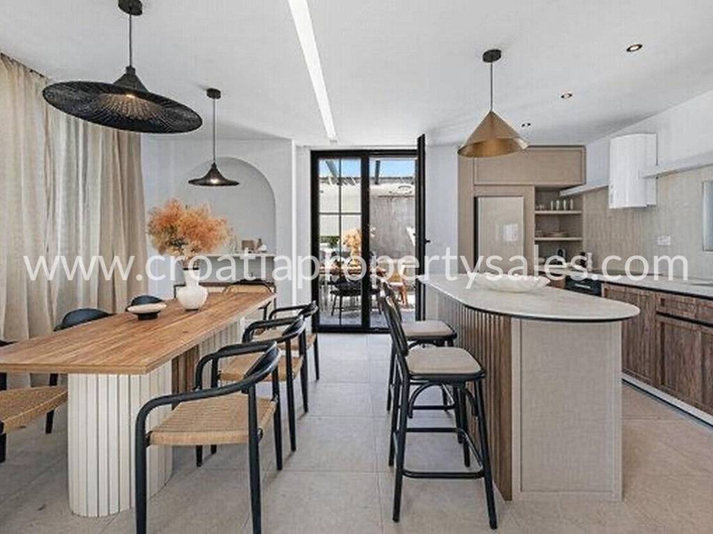 Newly built villa with a swimming pool in the first row to the sea in a quiet bay 10 minutes from Sibenik centre. It consists of two floors and a spacious garden. The ground floor has a kitchen, dining room, living room, storage/technical room, bathroom and one bedroom. On the first floor there are three bedrooms. An en-suite master bedroom with a walk-in wardrobe and private terrace, two further bedrooms share a common bathroom and each room has its own balcony. Outside there is a covered summer kitchen with a traditional built-in BBQ, swimming pool and covered parking area. There are six air conditioning units, floor heating and solar systems. The villa has excellent rental potential and is currently rented until the beginning of April so cannot be viewed inside during this time. (serious buyers please enquire). The villa was finished in June 2024. The price is fixed.