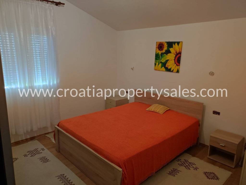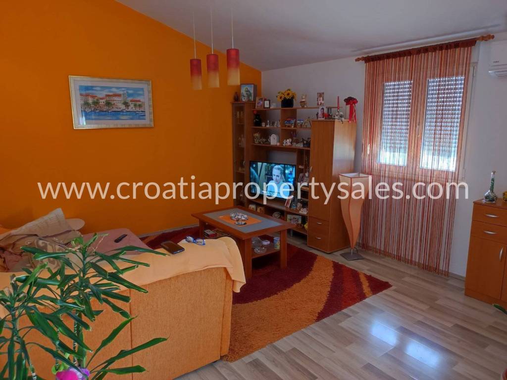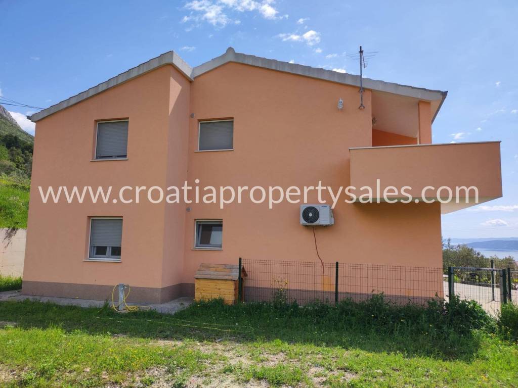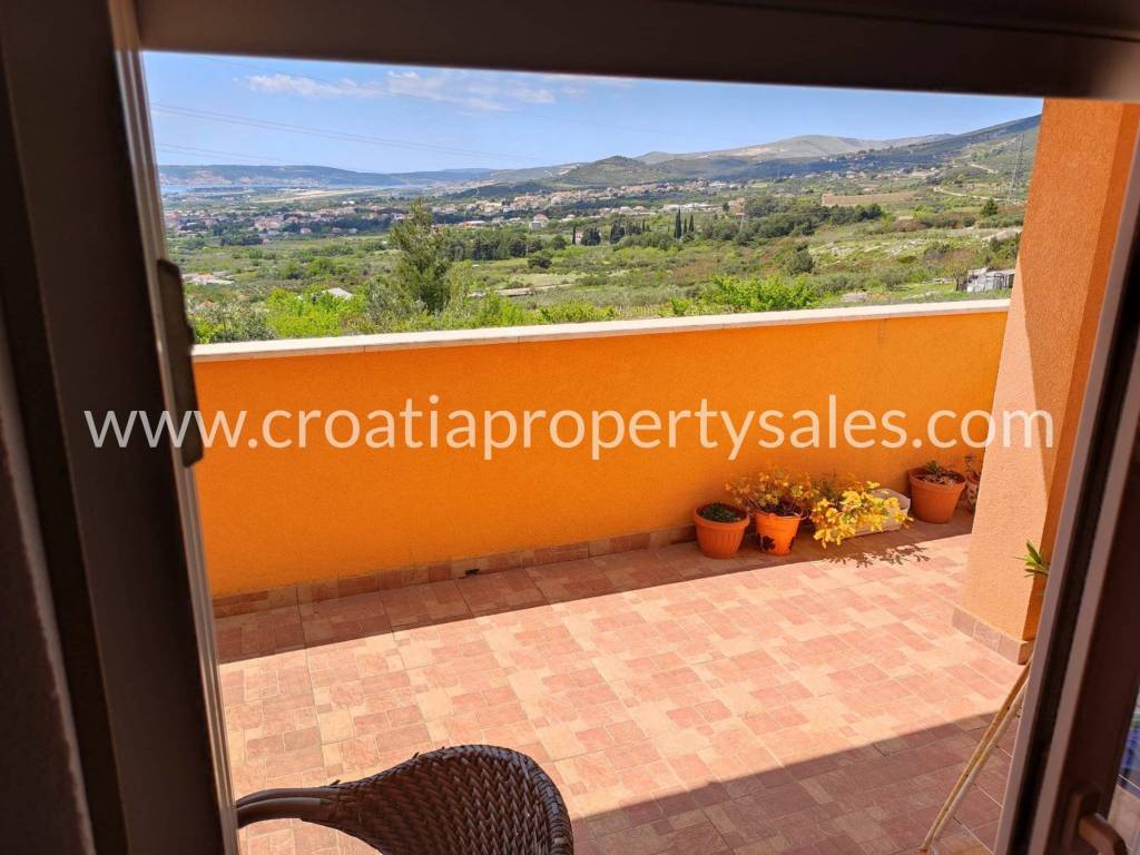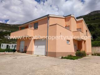Detached house in a quiet part of Kastela with a beautiful sea view. It consists of the ground floor and one upper floor. On the ground floor there is a spacious garage and a one-bedroom apartment. Upstairs there is a big three bedroom apartment, consisting of a living room with dining area, three bedrooms and two bathrooms, and a large terrace with sea view. The property offers a range of options due to the location and size of the land. The house does need some modernization on the inside. Around the house is a big courtyard, partially paved.